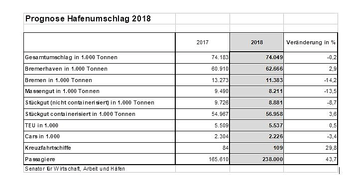 An den Kajen und Terminals der Zwillingshäfen in Bremen und Bremerhaven wird für das Jahr 2018 auf Basis der vorliegenden Meldungen des Statistischen Landesamtes Bremen ein seeseitiger Güterumschlag von ca. 74 Mio. Tonnen erwartet. Gegenüber dem Güterumschlag des Vorjahrs mit rund 74,2 Mio. Tonnen ist dies weiterhin ein gutes und konstantes Ergebnis.
