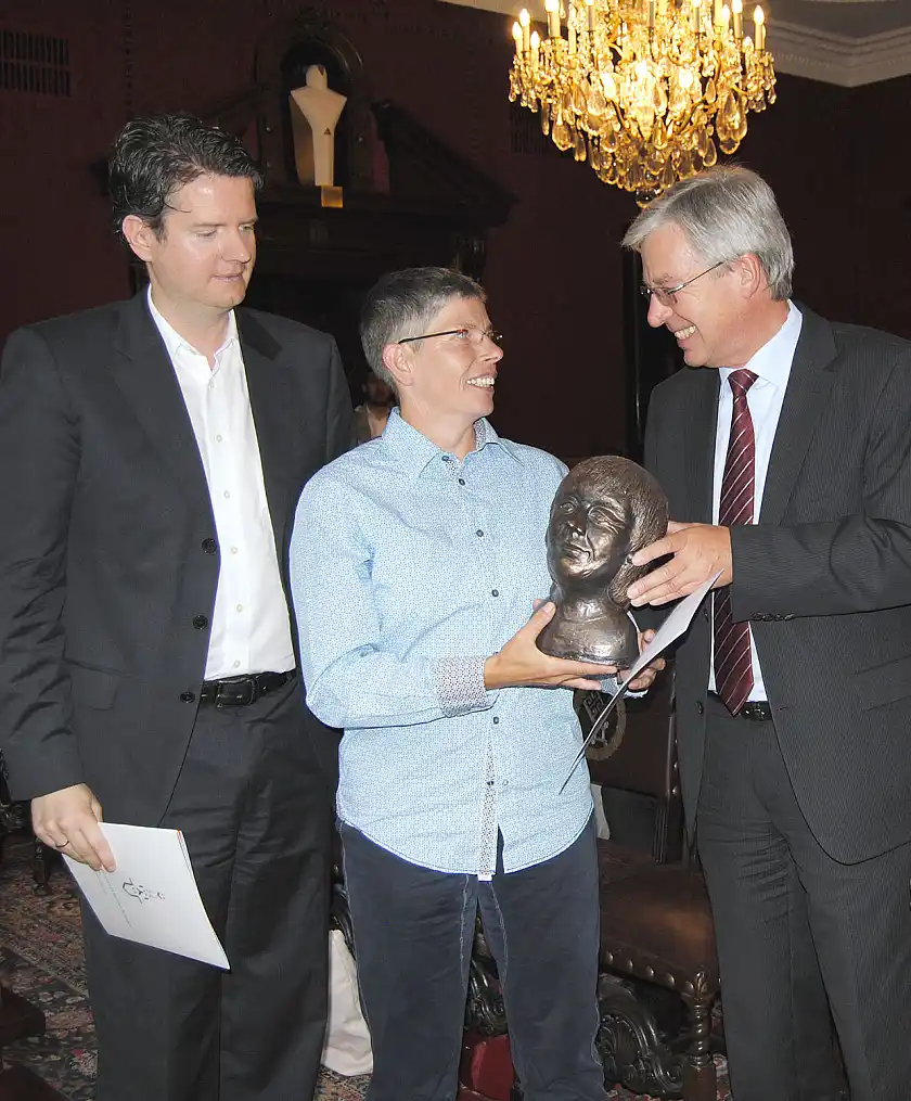 Bürgermeister Jens Böhrnsen überreicht im Beisein von Lars Haider (li.) Silke Susan Rotermund die Hilde-Adolf-Büste