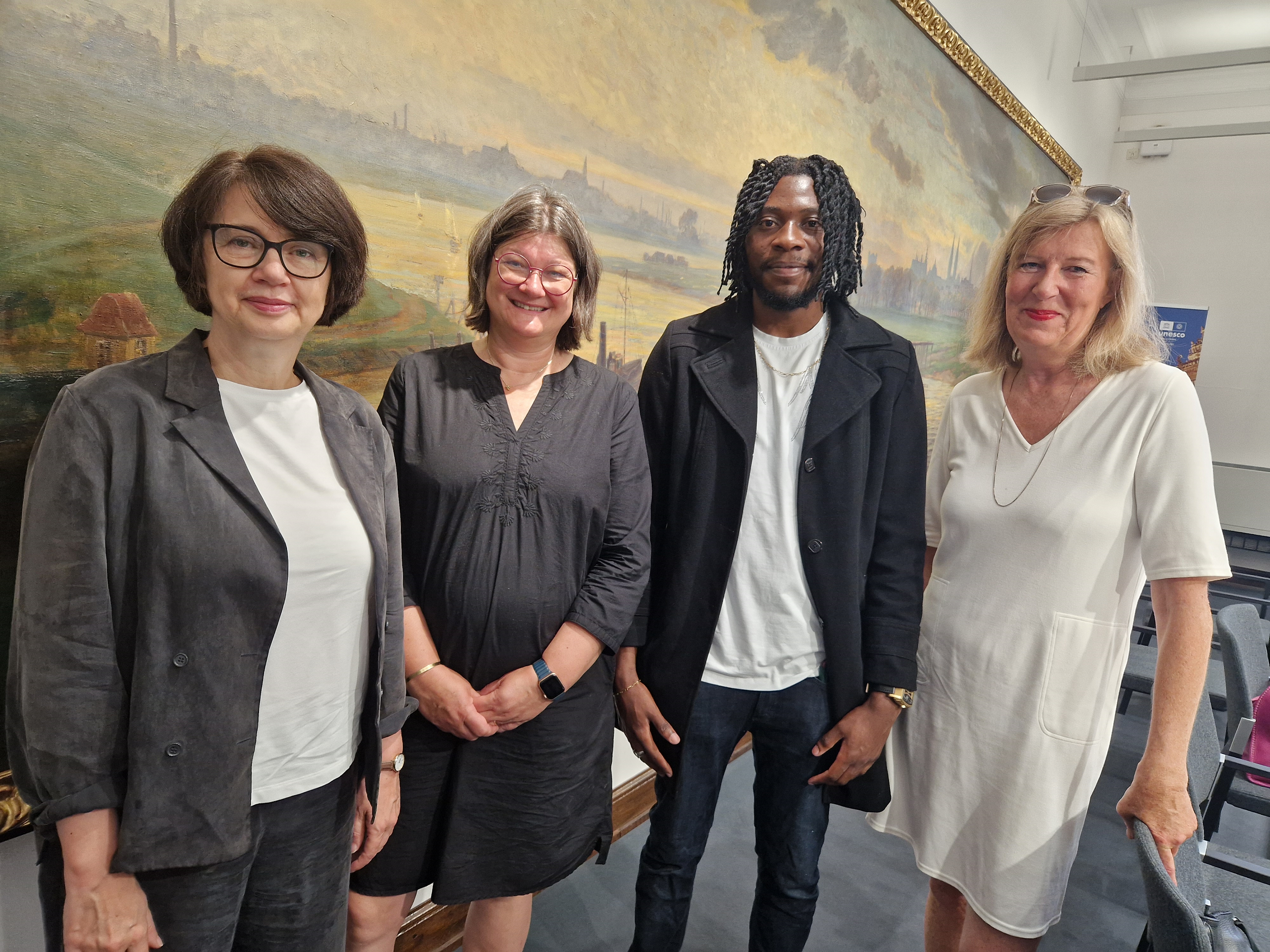 Claudia Bernhard (Senatorin für Gesundheit, Frauen und Verbraucherschutz), Anke Schmidt (Beraterin Bleib dran an der Pflege), Magloire Donkeng Songning (Auszubildender zum Pflegefachmann) und Elke Heyduck (Geschäftsführerin der Arbeitnehmerkammer Bremen). Foto: Arbeitnehmerkammer Bremen