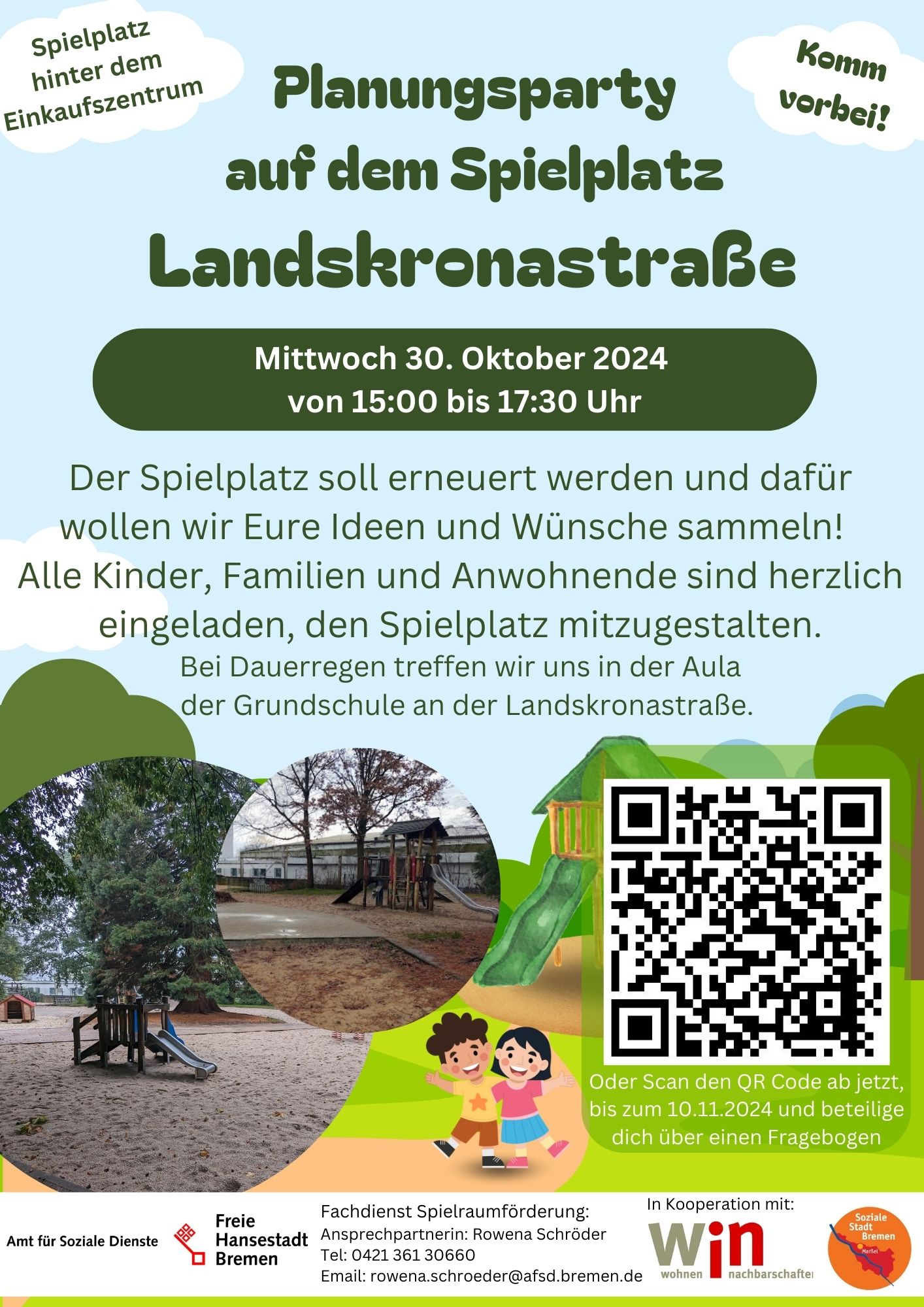 Am 30.Oktober 2024 von 15 bis 17.30 Uhr findet eine Planungsparty auf dem Spielplatz statt. Es wird vielfältige Möglichkeiten geben, die Ideen und Anregungen festzuhalten, Kinder können kleine Spielplatzmodelle bauen oder malen. Bei Dauerregen wird die Planungsparty in der Aula der Grundschule an der Landskronastraße stattfinden.