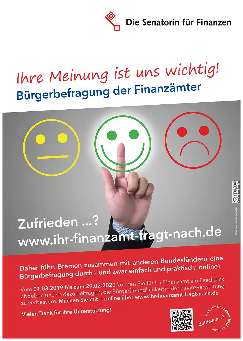 Am Freitag, 1. März 2019, startet eine bundesweite Online-Befragung zur Kundenzufriedenheit mit den Finanzämtern. An der länderübergreifenden Umfrage über das Internet können sich die Bürgerinnen und Bürger ein Jahr lang beteiligen. Unter anderem geht es um die Bewertung der Bearbeitung von Einkommenssteuererklärungen, der NutzerInnenfreundlichkeit der elektronischen Steuererklärung (ELSTER), der Erreichbarkeit der Finanzämter sowie des Verhaltens und der Kompetenz der Beschäftigten. Finanzsenatorin Karoline Linnert würde sich freuen, wenn viele Bürgerinnen und Bürger sich an der Umfrage beteiligen: „Ihre Meinung ist uns wichtig. Die Umfrageergebnisse werden uns helfen, unseren Service weiter zu verbessern.“