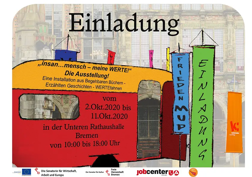 Das Projekt "insan…mensch - meine WERTE" wurde 2018 - 2020 vom k:ulturladen Huchting durchgeführt. Noch bis zum 11. Oktober 2020 kann die Austellung im Rathaus in der Unteren Halle besichtigt werden - täglich von 10 bis 18 Uhr, der Eintritt ist frei.