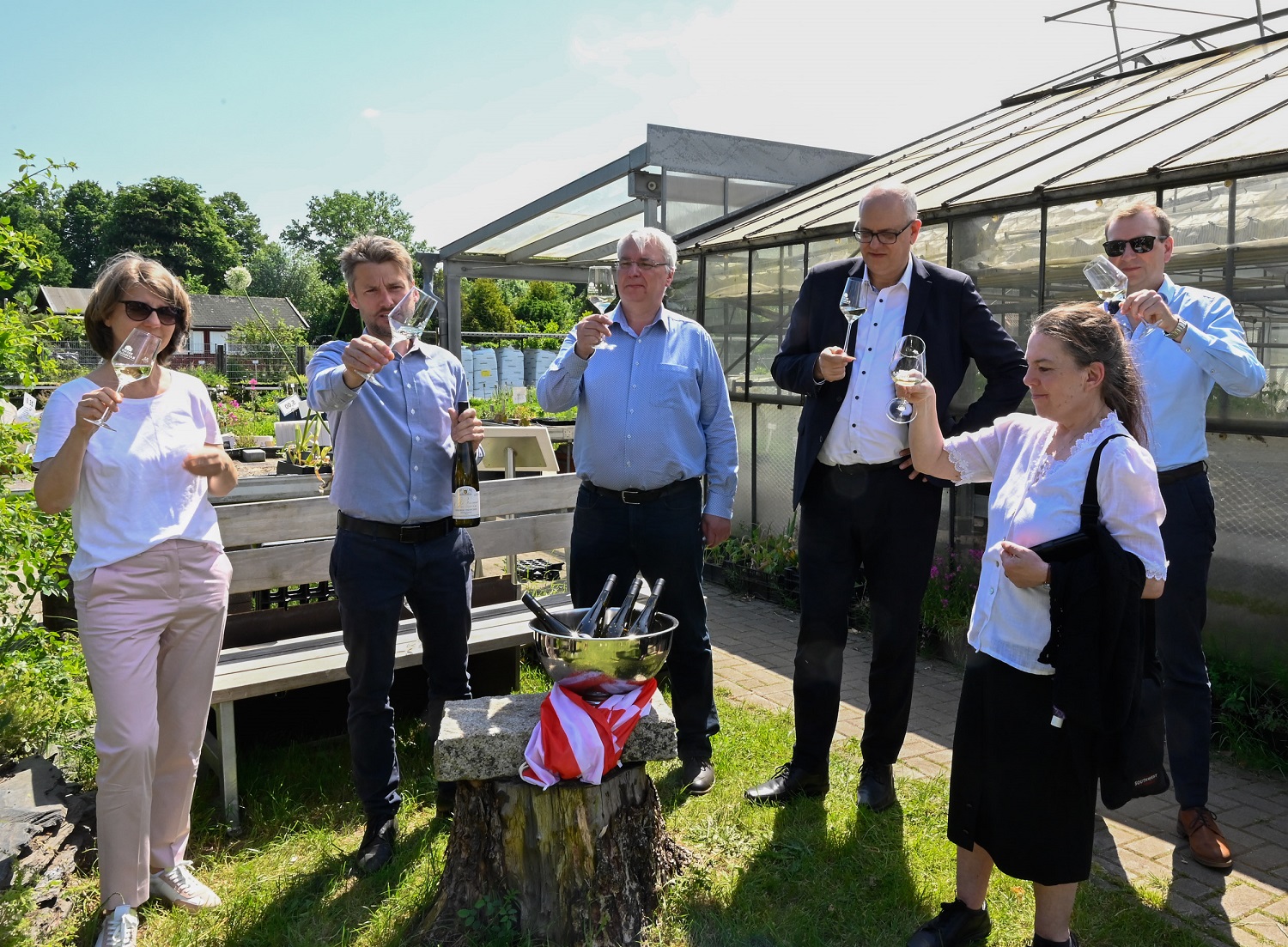 Weinvorstellung in der Martinshof Gärtnerei - (v.l.)  Martinshof-Geschäftsführung Sabine Kohler, Ratskellermeister Frederik Janus, Dirk Dieling von der Martinshof-Gärtnerei, Bürgermeister Andreas Bovenschulte, Martina Sarnowski-Lütjen (Martinshof) und Philipp Hirth von der Martinshof-Geschäftsführung