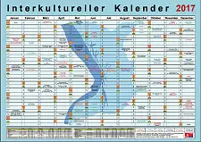 09.11.2016Der Interkulturelle Kalender für das Jahr 2017 ist jetzt erschienen. Der bunte Wandkalender im Format DIN A 2 gibt einen Überblick über die wichtigsten Feiertage von Christen, Muslimen, Juden, Hindus Buddhisten, Aleviten und verzeichnet darüber hinaus eine Reihe nationaler und internationaler weltlicher Gedenktage. Verzeichnet sind unter anderem das jüdische Jom Kippur am 30. September und das Laubhüttenfest vom 5. bis 11. Oktober 2017, das christliche Weihnachtsfest wie auch Mariä Himmelfahrt (gesetzlicher Feiertag im Saarland und den katholischen Gemeinden Bayerns am 15. August), der Beginn und das Ende des muslimischen Fastenmonats Ramadan vom 27. Mai bis 24. Juni mit dem anschließenden Zuckerfest, die Geburt Buddhas am 10. Mai 567 vor unserer Zeitrechnung, wie auch der Weltflüchtlingstag der UNO am 20. Juni, der Internationale Humanistentag am 21. Juni und der Gedenktag für den Genozid an den Roma am 2. August.