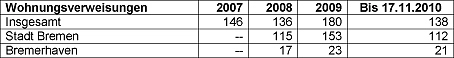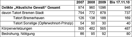 Die Frauenhäuser in Bremen und Bremerhaven sind nach wie vor ausgelastet. So hat das AWO-Frauenhaus im Jahr 2009 213 Frauen aufgenommen, davon 76 aus Bremen, bis Mitte November 2010 suchten hier 88 Frauen Schutz, davon 62 aus Bremen. Das Autonome Frauenhaus hat im vergangenen Jahr 156 Frauen (115 aus Bremen) und bis Mitte November dieses Jahres 155 Frauen (90 aus Bremen). Im Frauenhaus Bremen-Nord suchten 2009 36 Frauen Zuflucht, alle aus Bremen, in diesem Jahr sind es bereits 34, davon 27 aus Bremen. Insgesamt haben die Frauenhäuser in Bremen-Stadt im vergangenen Jahr 227 Frauen aus Bremen aufgenommen, in diesem Jahr sind es bis Mitte November 179 Bremerinnen. Das Bremerhavener Frauenhaus hat im Jahr 2009 141 Frauen aufgenommen, in diesem Jahr sind es bis Mitte November 112 Frauen.