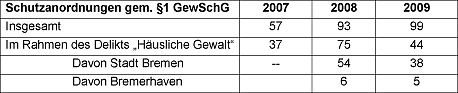 Die steigende Zahl der Verfahren nach dem Gewaltschutzgesetz (GewSchG) wertet die Landesfrauenbeauftragte als erfolgreich. „Das Gesetz zeigt Wirkung: Frauen werden selbstbewusster und klagen ihr Recht ein.“ Nach diesem Gesetz können Geschädigte eine im Eilverfahren erlassene Gewaltschutzanordnung beim Amts- oder Familiengericht erlangen, d.h. der Täter kann aus der Wohnung verwiesen werden. Bei der Staatsanwaltschaft gibt es ein Sonderdezernat „Gewalt gegen Frauen“. Das Statistische Lagebild der Polizei Bremen weist hier folgende Zahlen aus: