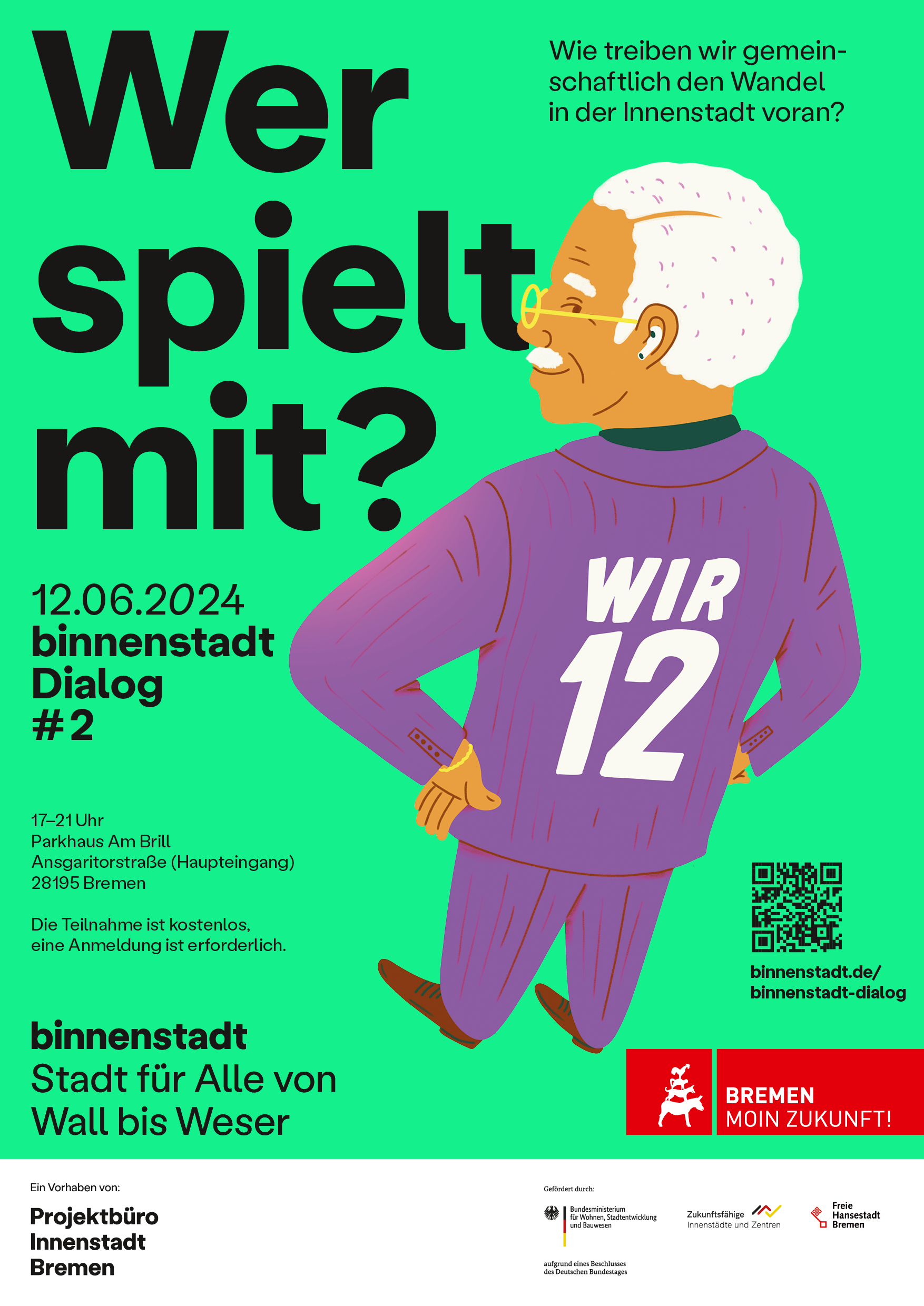 Am 12. Juni 2024 lädt das Projektbüro Innenstadt Bremen zum zweiten binnenstadt Dialog ein. Unter dem Motto "Wer spielt mit?" diskutieren Expertinnen und Experten, Akteurinnen und Akteure sowie Interessierte, wie der Wandel des Bremer Zentrums gemeinschaftlich vorangetrieben werden kann. Erste Interessierte und Planungsprofis haben sich bereits angemeldet, um sich auf den oberen Decks vom Parkhaus Am Brill auszutauschen, zu vernetzen sowie eigene Impulse zu setzen.