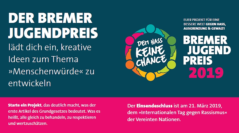 • Jetzt wird’s Zeit: Noch zwei Monate für den Bremer Jugendpreis "Dem Hass keine Chance" – Abgabetermin ist am 21. März 2019
