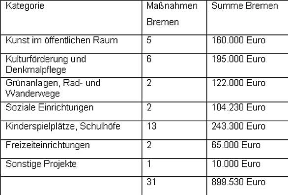 Da in vielen Fördermaßnahmen Globalmittel enthalten sind, die je nach Bedarf von den Empfängern für kleinere aktuelle Einzelprojekte eingesetzt werden können, z.B. Unterstützung privater Initiativen auf Spielplätzen, Denkmalpflege, Künstlerförderung, ist die Zahl der geförderten Maßnahmen deutlich größer.