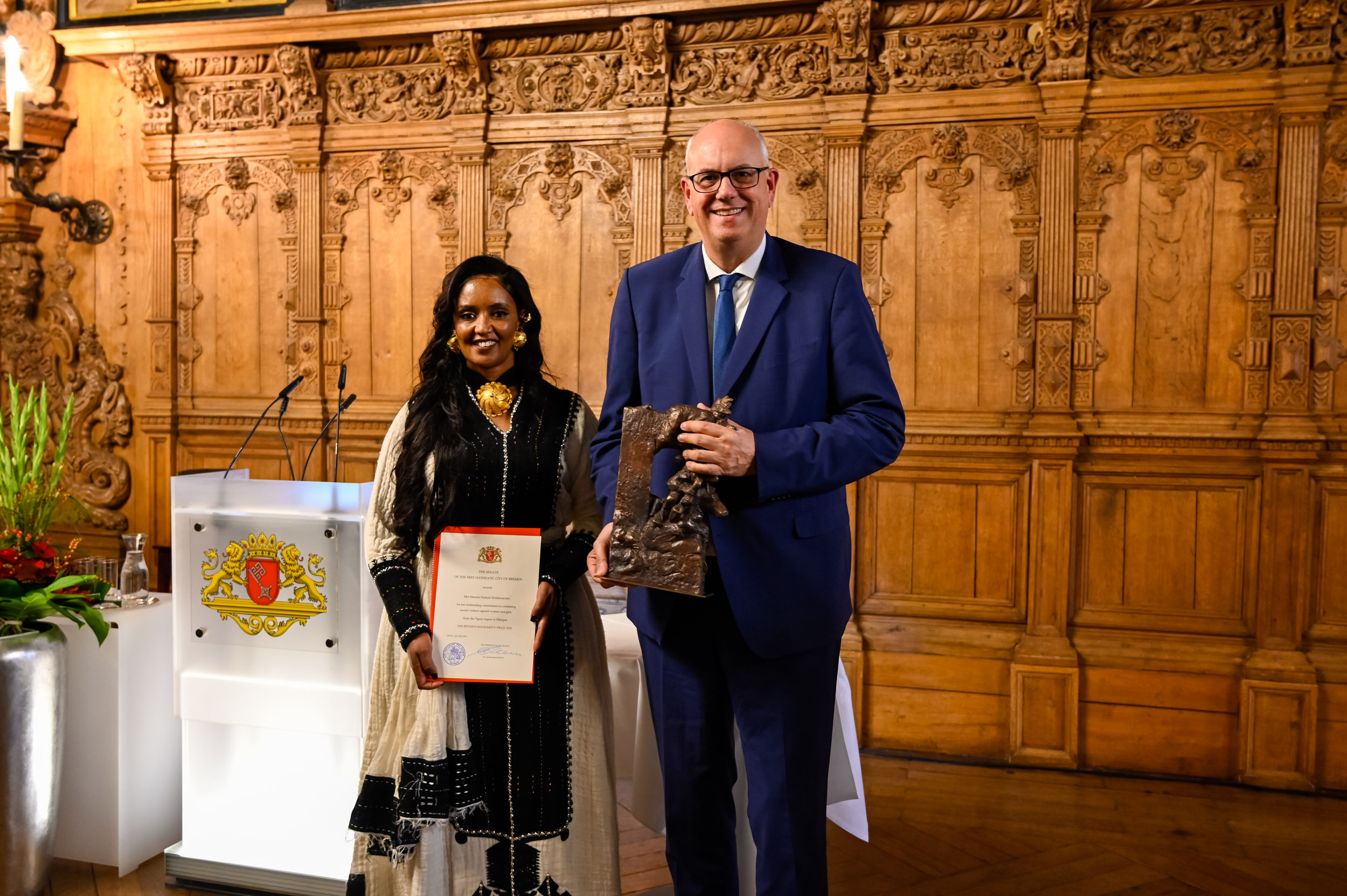 Die Preisträgerin Meseret Hadush und Bürgermeister Andreas Bovenschulte.