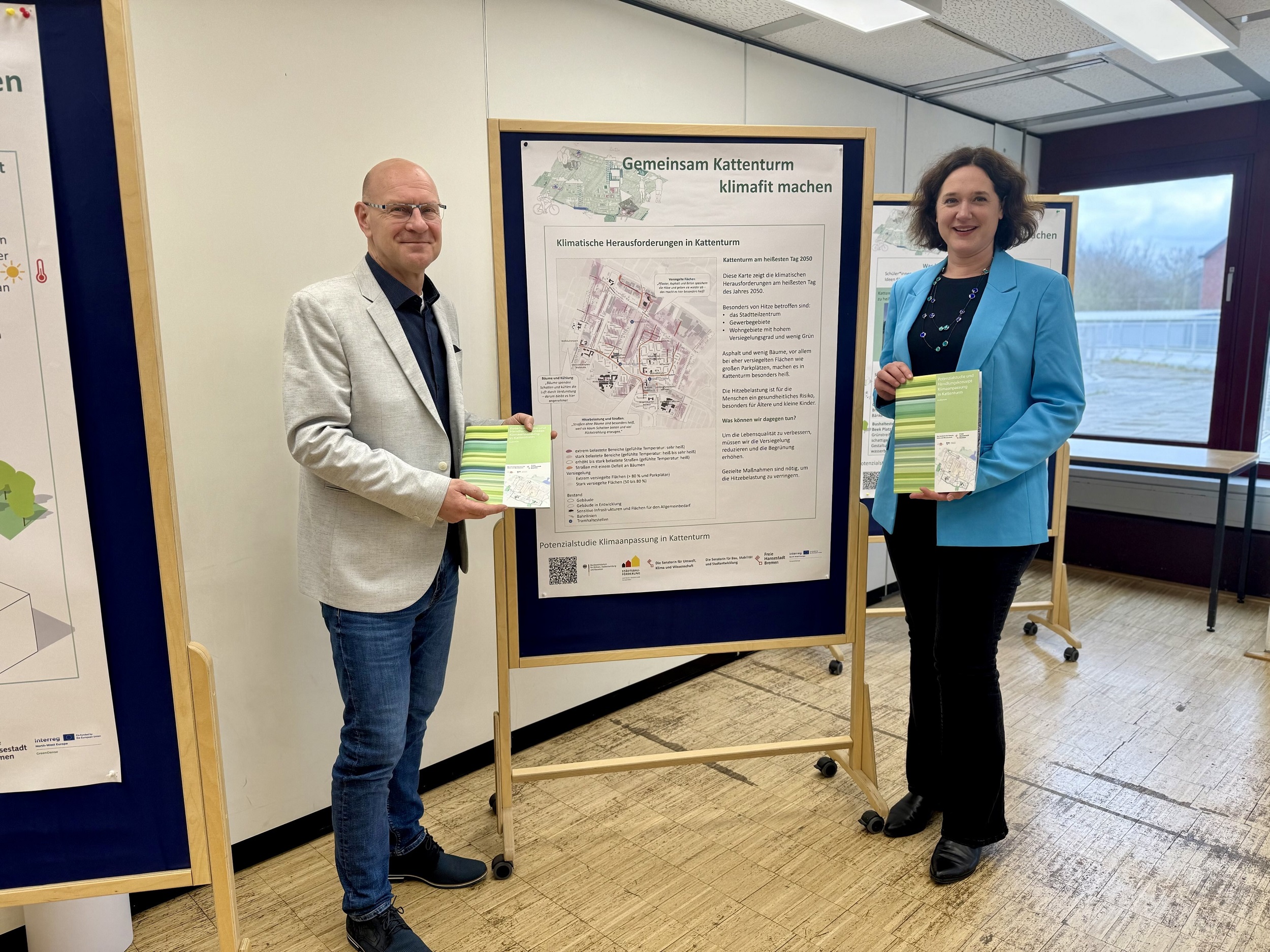 Die Senatorin für Umwelt, Klima und Wissenschaft, Kathrin Moosdorf, und der Leiter des Ortsamtes Obervieland, Michael Radolla, veröffentlichten die Potenzialstudie und Handlungskonzept Klimaanpassung in Kattenturm.