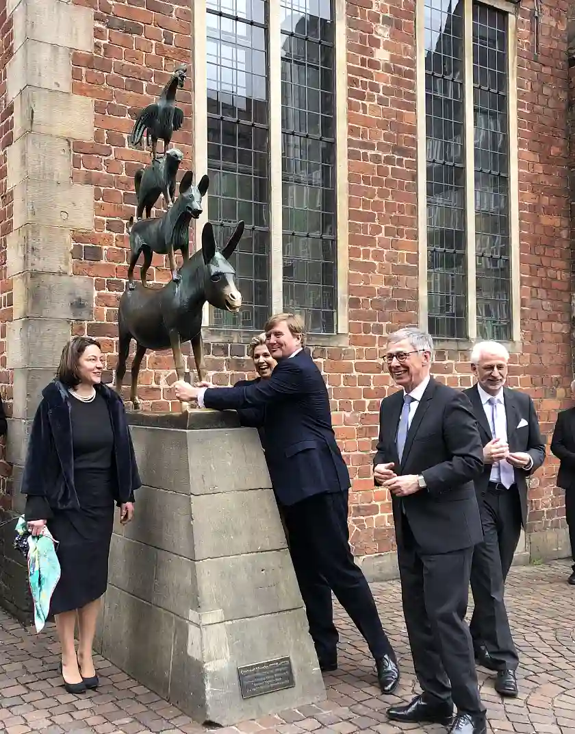 Am frühen Nachmittag machte das Königspaar einen Gang über den Marktplatz, wo sich viele hunderte Bremerinnen und Bremer und Touristen eingefunden hatten, um einen Blick auf das Königspaar zu werfen. Auf dem Weg zur Handelskammer kamen die Gäste aus den Niederlanden vorbei an den berühmten Bremer Stadtmusikanten aus dem Märchen der Brüder Grimm und dem Bremer Roland, Symbolfigur Bremens für die Freiheit der Hansestadt. Zusammen mit dem aus dem 15. Jahrhundert stammenden gotischen Rathaus zählt der Roland seit 2004 zum UNESCO-Welterbe. In der Handelskammer schauten sich der König und die Königin danach ein historisches Dokument aus dem Jahr 1705 an, in dem Vereinbarungen mit Vertretern der Handelsschifffahrt aus Ländern und Städten festgelegt wurden, die damals niederländische Gewässer anfuhren. Dank ihrer günstigen geographischen Lage am Wasser ist die Hansestadt Bremen seit alters ein wichtiges Handelsdrehkreuz. Die Verbundenheit der Niederlande mit Bremen reicht 1200 Jahre zurück.