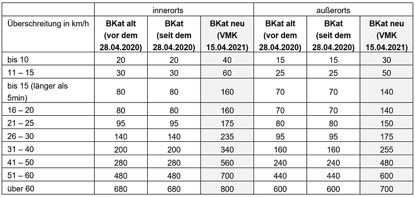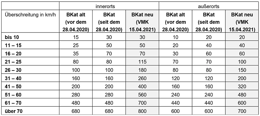 Für normale Pkw bis 3,5 Tonnen werden die Sanktionshöhen in Euro bei Geschwindigkeitsüberschreitungen wie folgt erhöht: