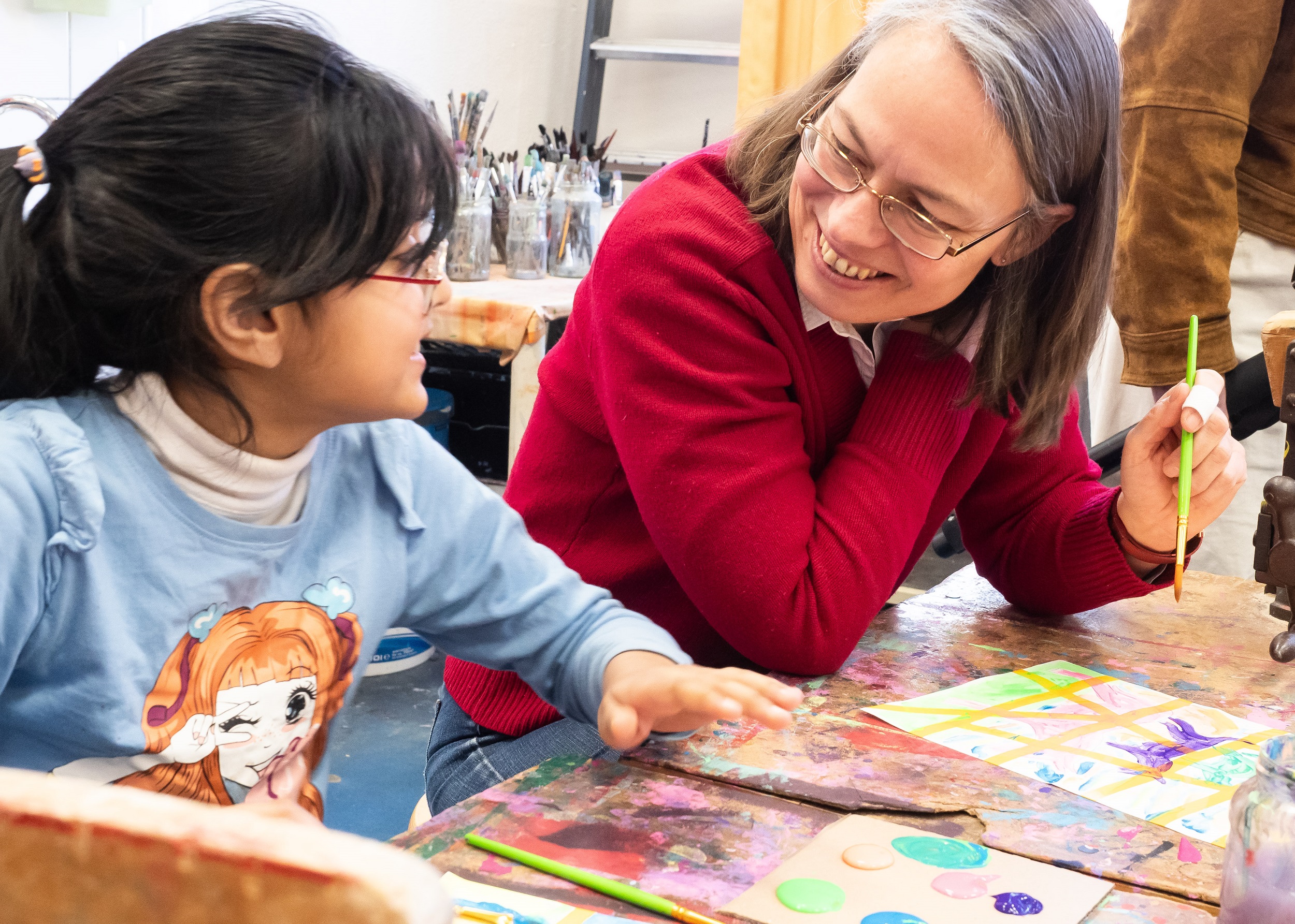 Bei ihrem Besuch der Grundschule an der Glockenstraße am heutigen Montag (17. März 2025) hat die Senatorin für Kinder und Bildung, Sascha Karolin Aulepp, spontan selbst zu Pinsel und Farbe gegriffen. Gemeinsam mit den Schülerinnen und Schülern gestaltete sie die Bremer Stadtmusikanten. Kunsttherapeutin Christiane Gruber von der Kunsthalle Bremen leitete den kreativen Schaffensprozess. Im Rahmen des Startchancen-Programms des Bundes hat das Bildungsressort zusammen mit der Kunsthalle ein Kunstprojekt für rund 300 Schülerinnen und Schüler in Bremen und Bremerhaven gestartet.