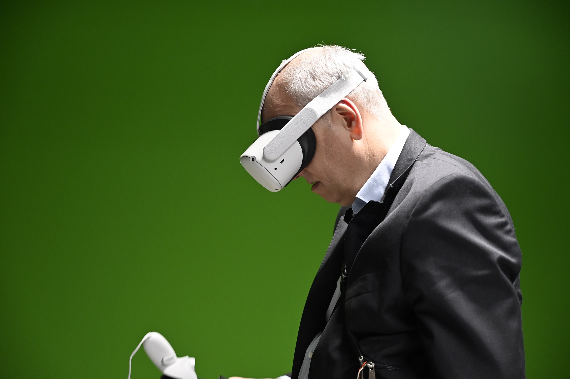 Bürgermeister Dr. Andras Bovenschulte mit einer Brille für das Anzeigen vor Virtual-Reality-Animationen. Foto: Senatspressestelle