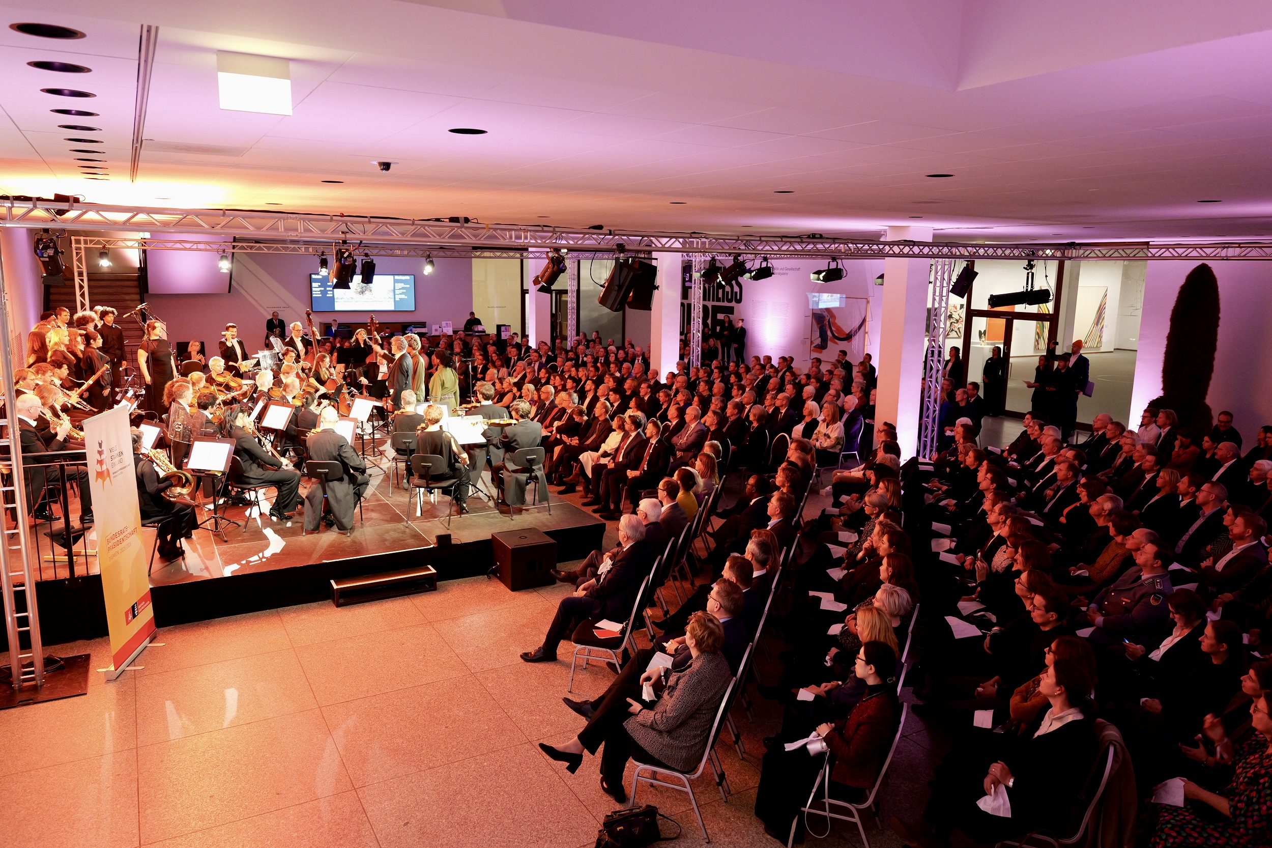 Zuvor hatte Prof. Dr. Marion Ackermann als Präsidentin der Stiftung Preußischer Kulturbesitz, zu der auch die Neue Nationalgalerie gehört, ihrer Freude Ausdruck verliehen den Ort für diese besondere Veranstaltung zur Verfügung zu stellen. Der Abend sei somit sinnbildlich für Kooperationen von Ländern und Stiftung, die gemeinschaftlich von Bund und Ländern getragen wird.