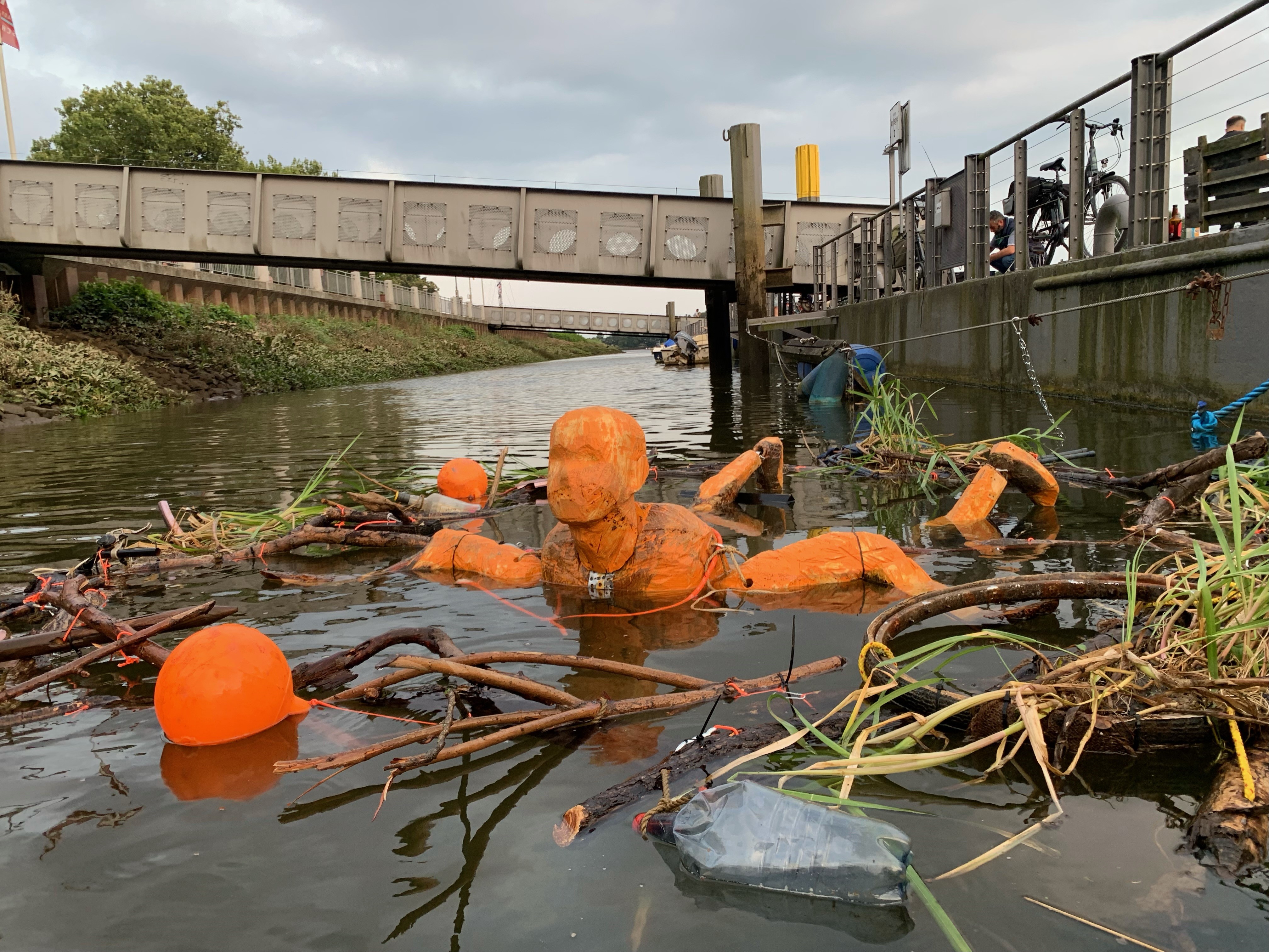 Mohar Kalra zu seiner Installation auf der Weser: "An der Weserpromenade schwimmt der 'Breman' im Fluss. Da der Fluss zweimal am Tag seine Richtung ändert, wendet sich Breman immer der entgegenkommenden Strömung zu und schwimmt gegen den Strom, wie ein Bremer Sisyphos. Er trägt ein verworrenes Nest aus Treibgut mit sich, das irgendwann einmal die Weser hinunter geschwemmt wurde und zu einer Ursuppe geronnen ist, aus der der Breman auftaucht.“