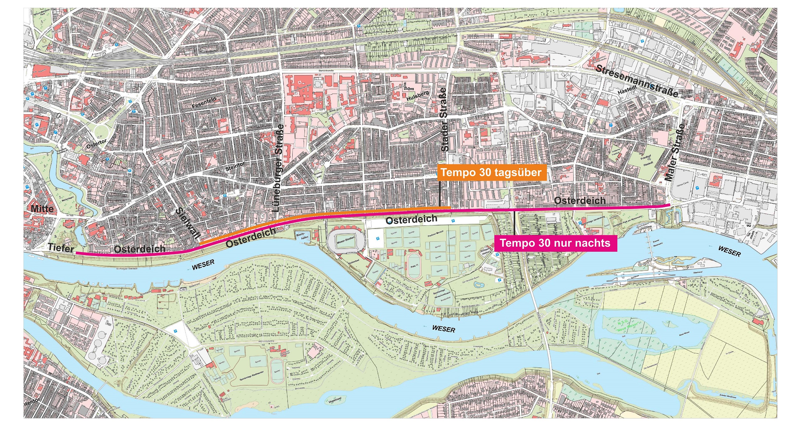 Daraus ergibt sich zukünftig eine Tempo-30-Regelung nachts (22-6 Uhr) auf dem gesamten Straßenzug zwischen Malerstraße und Theatergarage. Rund-um-die Uhr soll Tempo 30 im gesamten Mittelstück zwischen Stader Straße und Sielwall gelten.