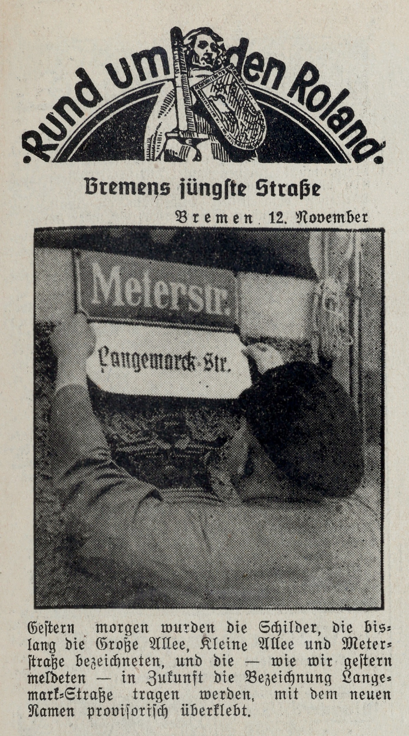 Umbenennung der Meterstraße in Langemarckstraße – Meldung aus der Bremer Zeitung vom 12. November 1937.