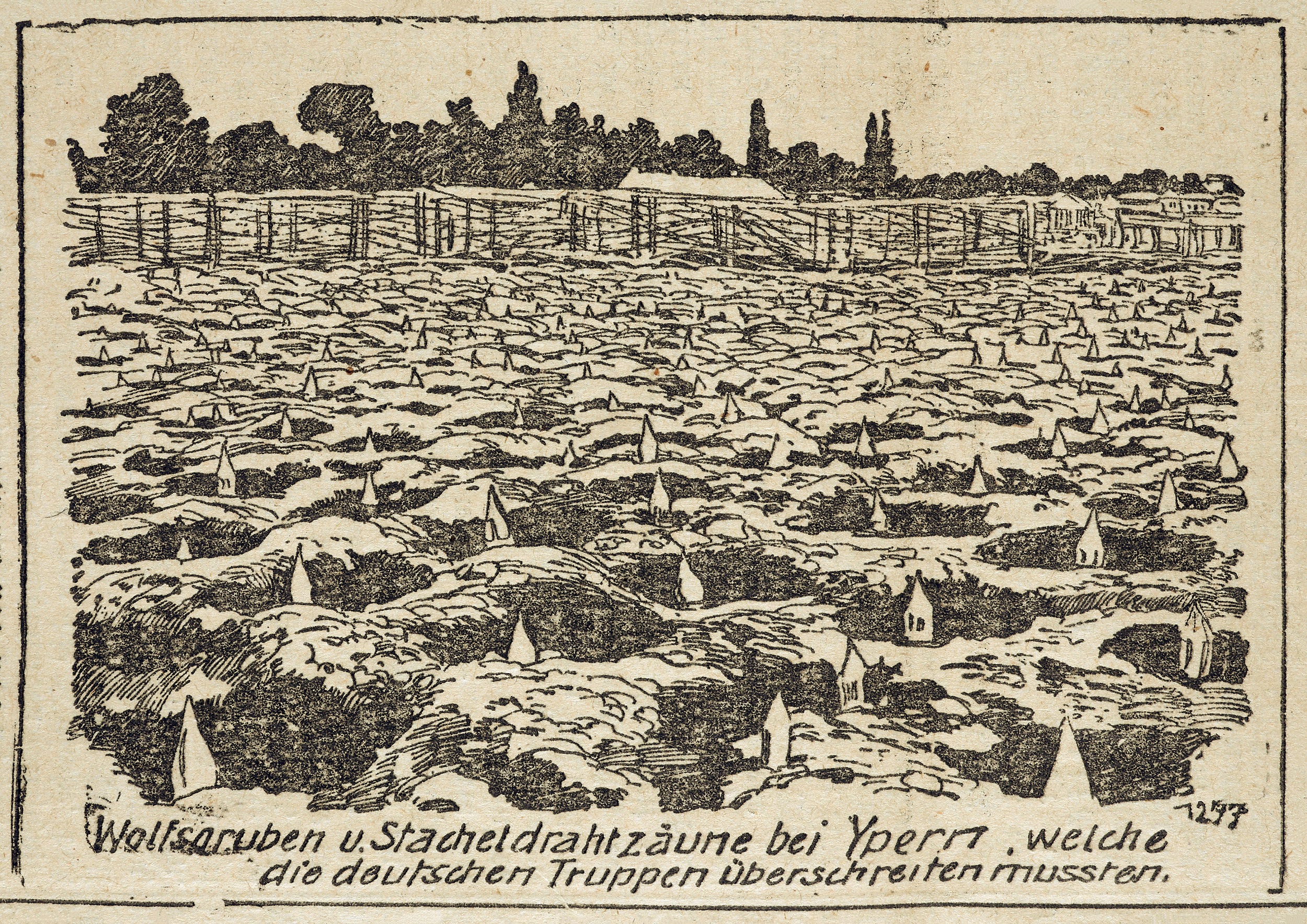 Verteidigungsanlagen (Wolfsgruben und Stacheldrahtzäune) bei Ypern – Meldung aus der Bremer Bürgerzeitung vom November 1914.