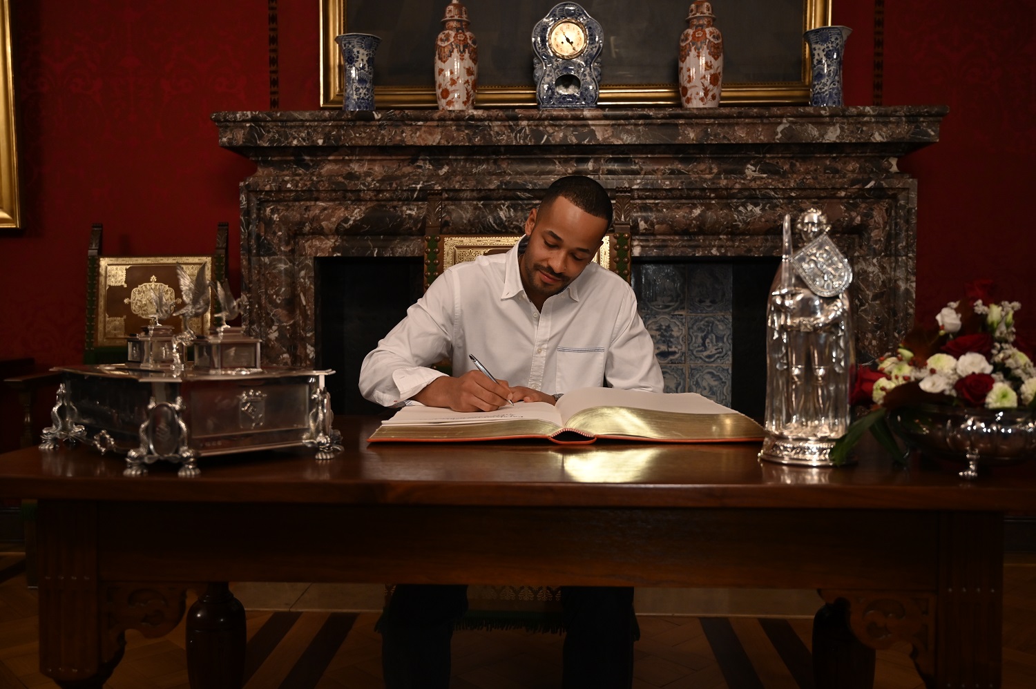 Der Paralympics-Olympionike Leon Schäfer während der Eintragung in das Goldene Buch. Foto: Senatspressestelle
