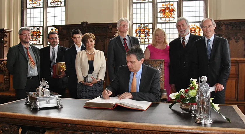 Der neue Botschafter der Republik Malta, Carl Charles Xuereb (sitzend), hat sich heute (29.06.2012) anlässlich seines Antrittsbesuches in das Goldene der Hansestadt Bremen eingetragen.
