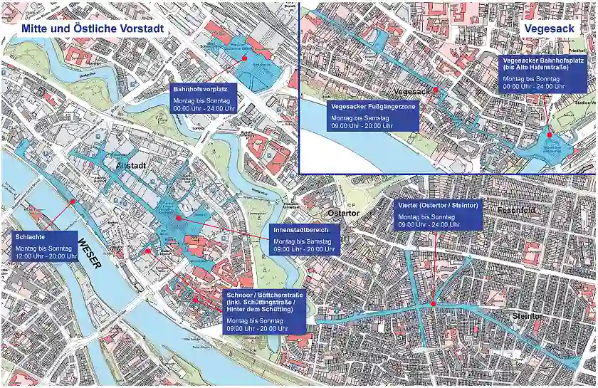 Richtung Süd-Ost: Am Dom inklusive der kompletten Domsheide bis Ecke Violenstraße (Nord) und Beginn der Ostertorstraße (Süd-Ost).