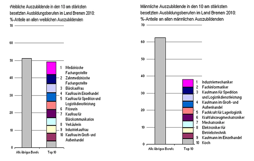 Der beliebteste Ausbildungsberuf bei Frauen war medizinische Fachangestellte (495), gefolgt von zahnmedizinischer Fachangestellter. Bei den jungen Männern steht der Industriemechaniker auf Platz 1 mit 410 Auszubildenden, gefolgt vom Fachinformatiker mit 365 besetzten Ausbildungsplätzen. Fast 40 Prozent der männlichen Auszubildenden erlernen einen Beruf, der zu den zehn beliebtesten (männlichen) Ausbildungsberufen zählt, bei den Frauen lag der entsprechende Anteil sogar bei fast 50 Prozent. Abgesehen von Wechseln bei den Rangplätzen sind diese Listen der bevorzugten Berufswahl bei Männern und Frauen schon seit mehreren Jahren weitgehend konstant.