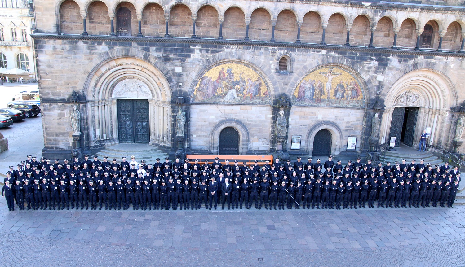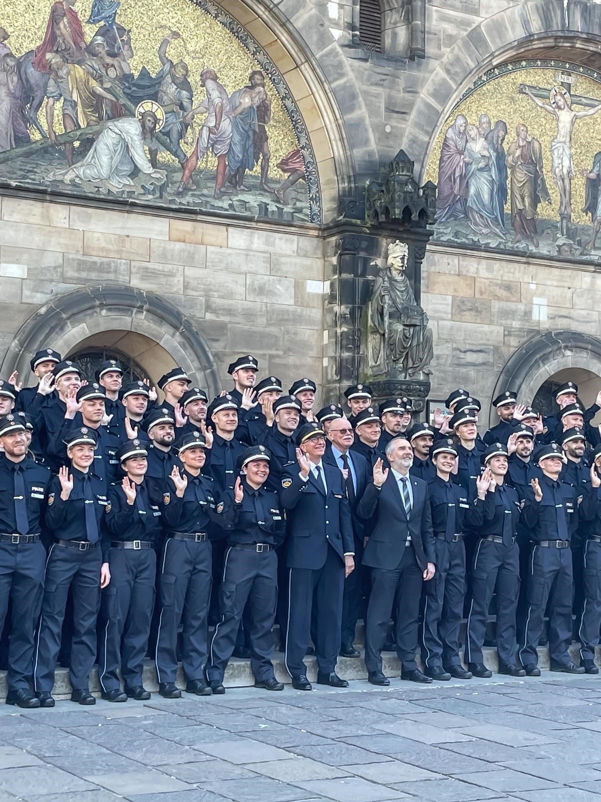 Bremens Polizeipräsident Dirk Fasse: "Die Studentinnen und Studenten haben sich für den Polizeiberuf entschieden und ich durfte sie heute auf unser Grundgesetz vereidigen. Eine Woche vor den Feierlichkeiten zum 75-jährigen Bestehen unserer Verfassung. Es ist wichtig, dass sich junge Menschen in dieser Zeit entscheiden, für unsere Demokratie einzustehen. Dafür haben sie meinen Respekt."