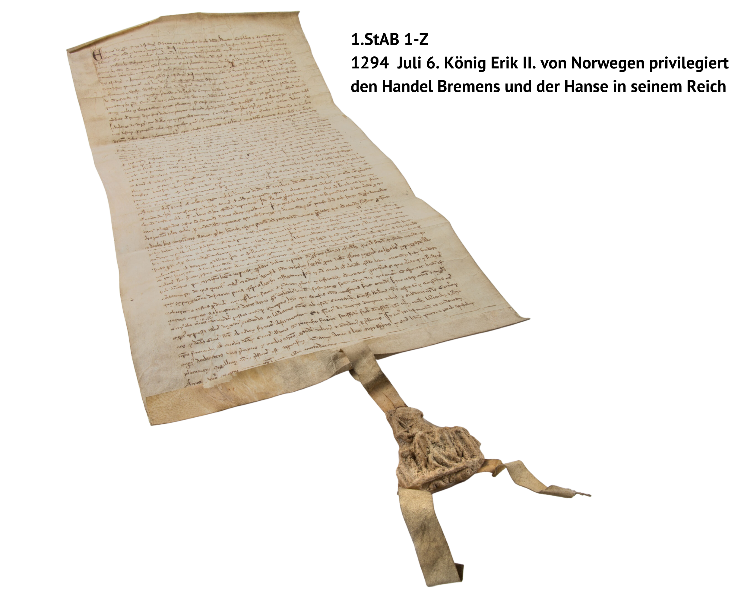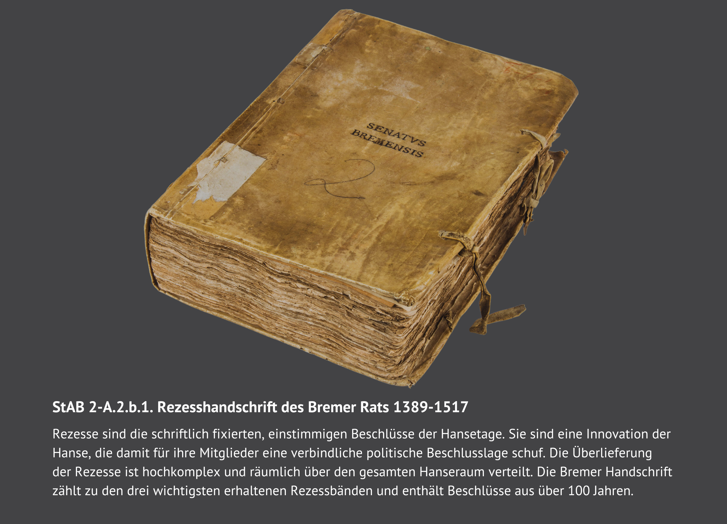 Damit wurden einzigartige Aufzeichnungen und Urkunden zum UNESCO-Weltdokumentenerbe erklärt, allen voran drei Folianten mit Hanserezessen, den Beschlussfassungen der Hansetage, darunter die älteste Rezesshandschrift des Bremer Rats (1389 - 1517). Hinzu kommen Handelsverträge wie der zwischen Bremen, den Hansestädten und dem Königreich Norwegen von 1294, dessen Original im Staatsarchiv Bremen verwahrt wird. Zolllisten aus Thorn, Kaufmannsbriefe aus Reval, Urkunden aus Bremens Partnerstadt Riga sowie Dokumente zu den Hansekontoren in Brügge, London, Bergen und Nowgorod runden das Bild ab.