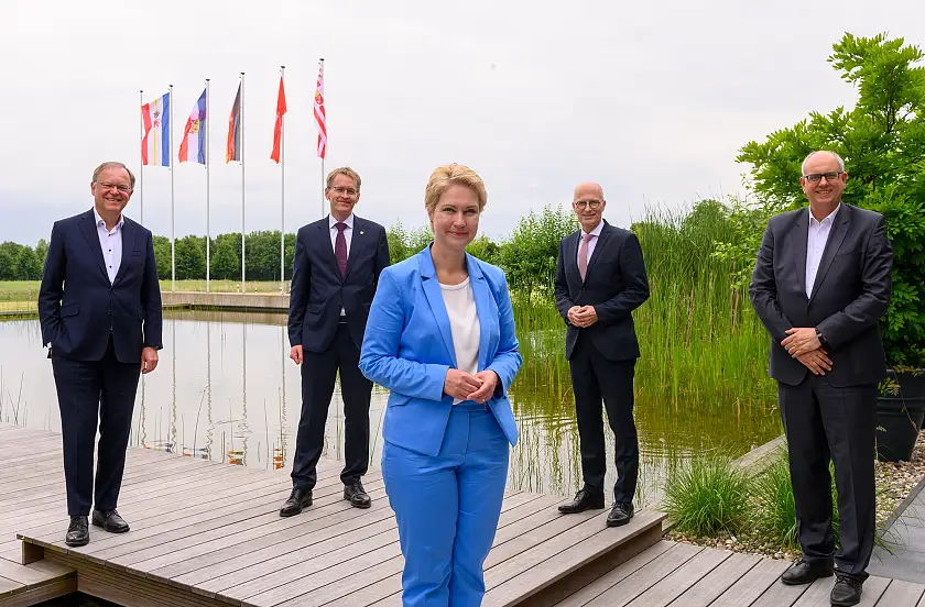 Die norddeutschen Länder Mecklenburg-Vorpommern, Schleswig-Holstein, Hamburg, Bremen und Niedersachsen wollen wirtschaftlich gestärkt aus der Corona-Pandemie hervorgehen und insbesondere beim Ausbau der erneuerbaren Energien und der Wasserstofftechnologie weiter eng zusammenarbeiten. Das beschlossen die Regierungschefin und die Regierungschefs heute bei ihrem jährlichen Treffen in Laage (Landkreis Rostock, Mecklenburg-Vorpommern).
