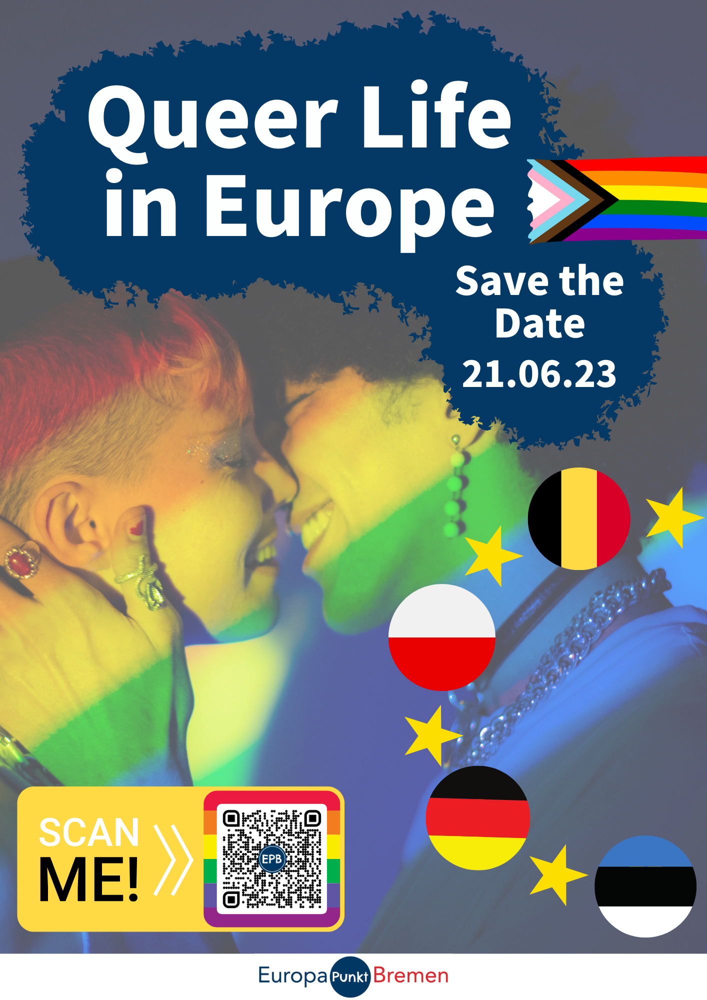 16.06.2023Wie leben queere Menschen in Europa? Was beschäftigt sie und wie erleben sie den Alltag als Teil der LGBTQIA+ Community? Im Rahmen des Pride Months und darüber hinaus ist es wichtig, auf die Wünsche und Probleme der queeren Community europa- und weltweit aufmerksam zu machen und vor allem queere Menschen selbst zu Wort kommen zu lassen. Dafür bietet die englischsprachige Veranstaltung "Queer Life in Europe" am Mittwoch, 21. Juni, um 17.30 Uhr, im EuropaPunktBremen eine Plattform. Die Diskussion soll den Zuhörenden Raum geben, ihre Fragen zu stellen und den Austausch für LGBTQIA+ Menschen und unterstützende Personen, sogenannte Allys, europaweit stärken.