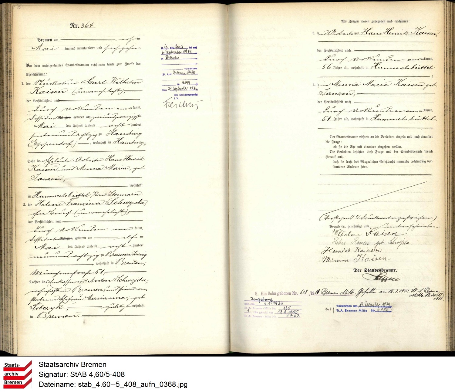 Interessierte können nun Informationen zu Millionen unbekannter oder auch bekannter Bremerinnen und Bremer recherchieren (siehe Foto: Heiratseintrag von Bürgermeister Wilhelm Kaisen und Helene Kaisen von 1916).