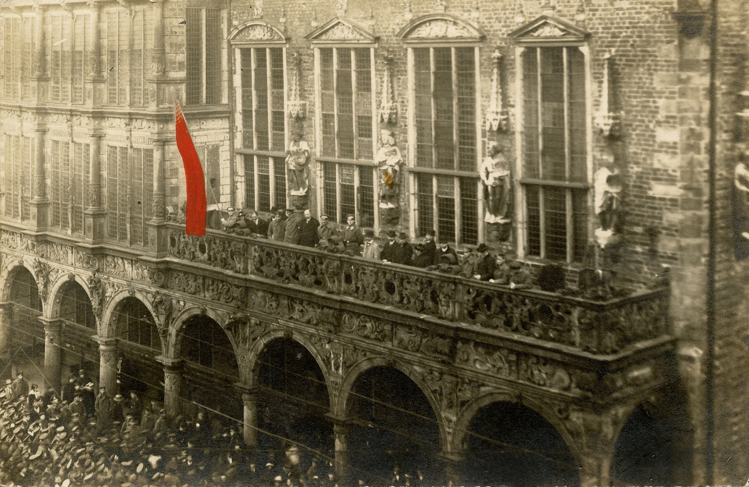 Eine Woche später war der vereinte Arbeiter- und Soldatenrat das höchste Organ der Hansestadt; Senat und Bürgerschaft wurden aufgelöst. Sinnbildlich dafür steht das Bild von Räten mit der Roten Fahne der Revolution auf dem Rathausbalkon bei der Verkündung der Machtübernahme durch den Arbeiter- und Soldatenrat am 15. November 1918. Damit trat die bisherige Bremer Verfassung außer Kraft, die ein per Acht-Klassen-Wahlrecht geformtes Parlament und auf Lebenszeit bestimmte Senatsmitglieder vorsah.