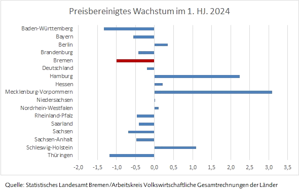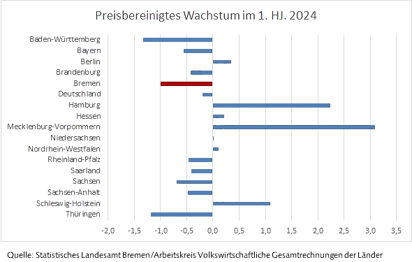Die Wirtschaftsleistung im Land Bremen ist nach ersten vorläufigen Berechnungen des Arbeitskreises "Volkswirtschaftliche Gesamtrechnungen der Länder", dem das Statistische Landesamt Bremen als Mitglied angehört, im ersten Halbjahr 2024 gegenüber dem Vorjahreszeitraum preisbereinigt um 1,0 Prozent zurückgegangen. Im Bund war der preisbereinigte Rückgang mit 0,2 Prozent etwas geringer.