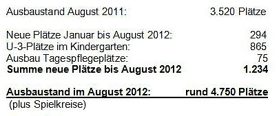 „Im Sommer 2012 haben wir dann rund 1200 Plätze für unter 3-jährige Kinder mehr als ein Jahr zuvor.“ Das Platzangebot steigt damit von gut 3500 (im Sommer 2011) auf mehr als 4700 Plätze (hinzu kommen knapp 600 Plätze in sozialpädagogischen Spielkreisen).