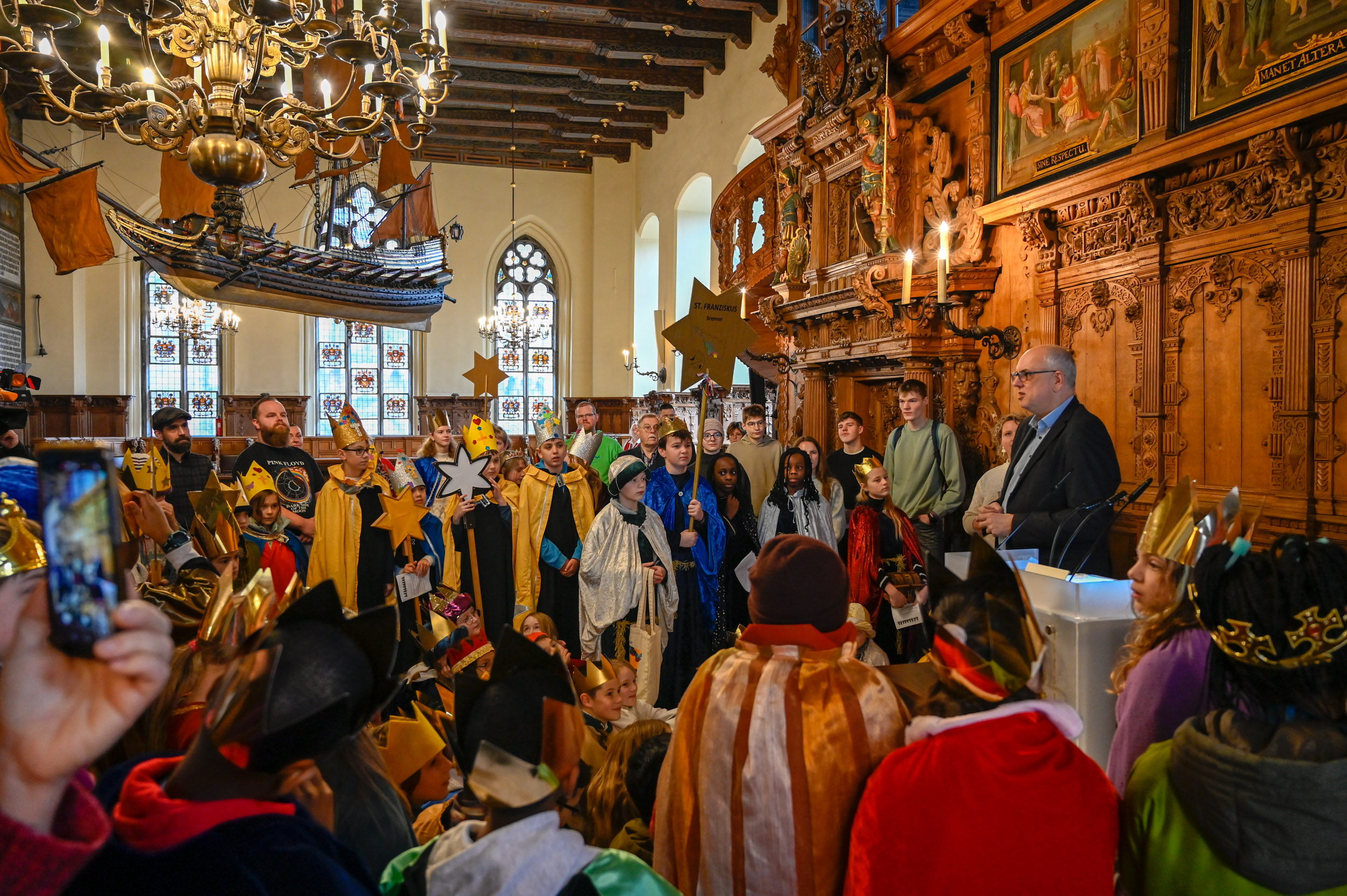 06.01.2025250 Millionen Kinder gehen weltweit nicht zur Schule. Die 67. Aktion Dreikönigssingen unter dem Motto "Erhebt eure Stimme! – Sternsingen für Kinderrechte" macht auf die Kinderrechtskonvention der Vereinten Nationen aufmerksam. Bürgermeister Andreas Bovenschulte begrüßte dazu heute (6. Januar 2025) rund 100 Sternsingerinnen und Sternsinger im Rathaus. Sie brachten den Segensspruch 20+C+M+B*25 (Christus Mansionem Benedicat = Christus segne dieses Haus) an der Eingangstür des Weltkulturerbes an.
