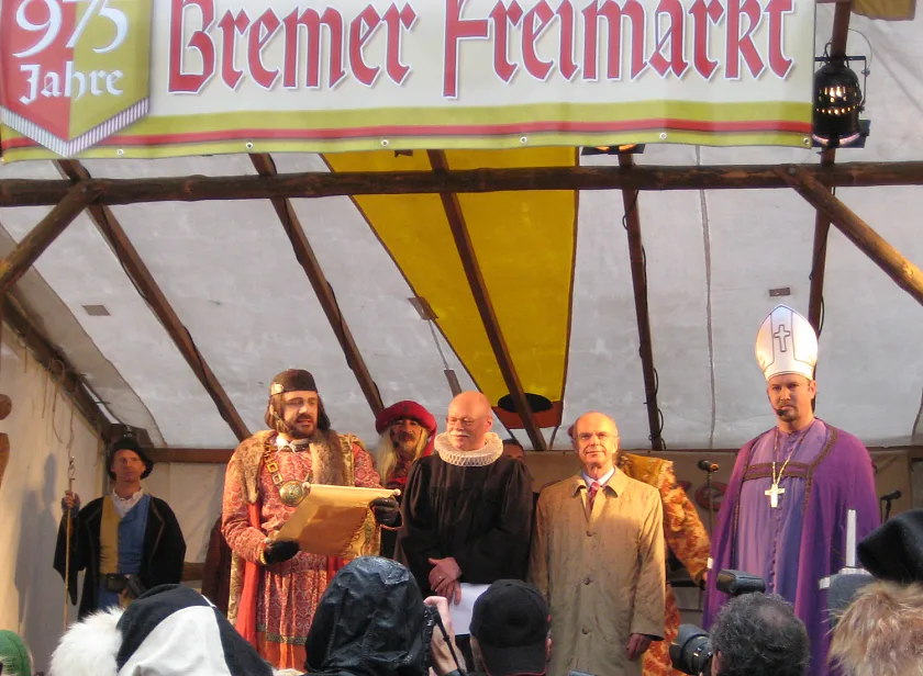 Mit einer eindrucksvollen Zeremonie ist am heutigen Freitag der 975. Bremer Freimarkt eröffnet worden. Sie erinnert daran, dass im Jahre 1035 Kaiser Konrad II die sogenannte Marktgerechtigkeit verlieh mit der Erlaubnis, dass Handwerker, Händler und Bauern ihre Waren frei in der Stadt anbieten durften. Aus diesen ersten Anfängen hat sich im Verlaufe der Jahrhunderte das größte Volksfest Norddeutschlands entwickelt. Rund 400.000 Besucherinnen und Besucher werden in der Zeit vom 15. bis 31. Oktober auf der Bremer Bürgerweide erwartet.