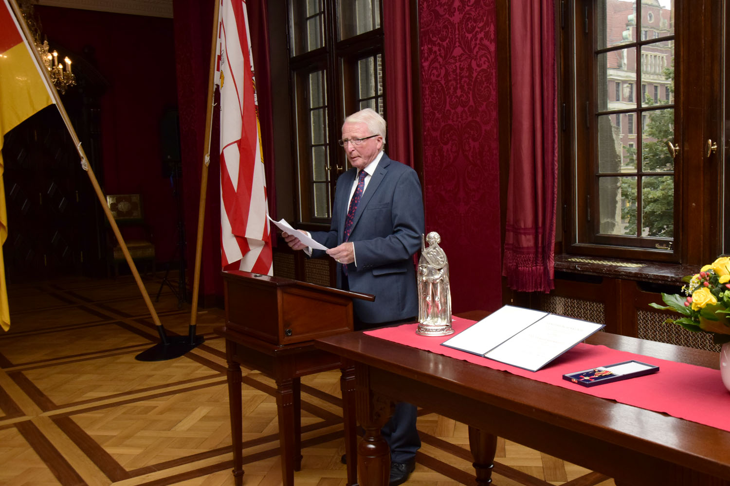 Bürgermeister Andreas Bovenschulte: "Sie engagieren sich seit langer Zeit und haben sich um das Gemeinwohl in Bremen vielfältig verdient gemacht. Ihr Einsatz für die Eiswette, für den Verein für Blinde, für die Bremische Evangelische Kirche und für die Inneren Mission: Das ist ein rundes Bild des Engagements."