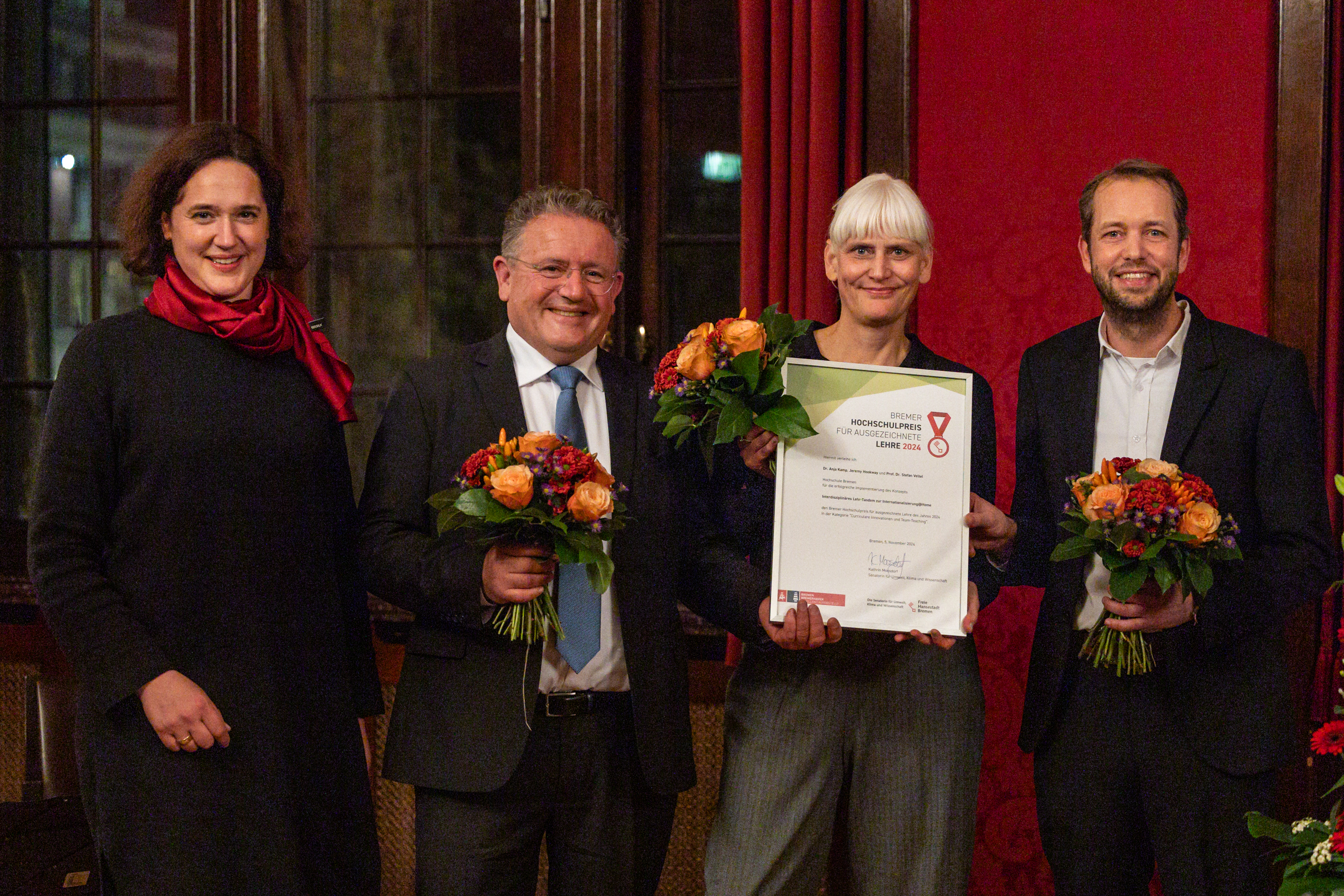05.11.2024Die Senatorin für Umwelt, Klima und Wissenschaft, Kathrin Moosdorf, hat heute (5. November 2024) im Rathaus den Bremer Hochschulpreis für ausgezeichnete Lehre 2024 verliehen. Ausgezeichnet wurde ein Team aus drei Lehrenden der Hochschule Bremen. Der Preis in der Kategorie "Curriculare Innovationen und Team-Teaching", dotiert mit 25.000 Euro, ging an Dr. Anja Kamp, Jeremy Hookway und Prof. Dr. Stefan Veltel für ihr Projekt "Interdisziplinäres Lehr-Tandem zur Internationalisierung@Home".