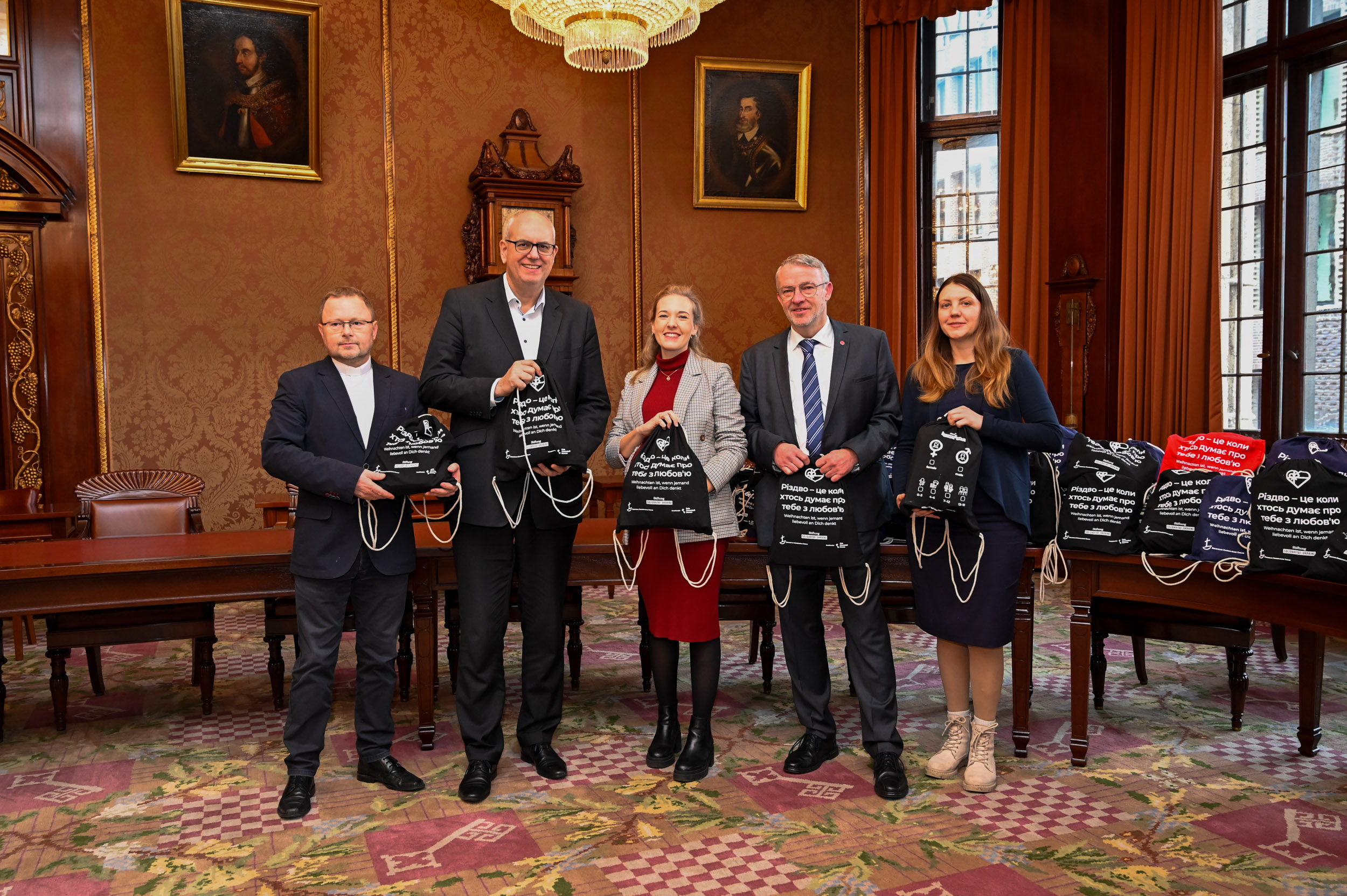 Im Senatssaal des Rathauses dankte Bürgermeister Andreas Bovenschulte den Organisatorinnen und Organisatoren der Weihnachtsbeutel-Aktion (von links): Pastor Andreas Hamburg von der St.-Markus-Gemeinde, Bürgermeister Bovenschulte, Alina Armerding und Roland Spiedel (Stiftung Solidarität Ukraine) und Kateryna Solopova (Senatskanzlei). Foto: Senatspressestelle.
