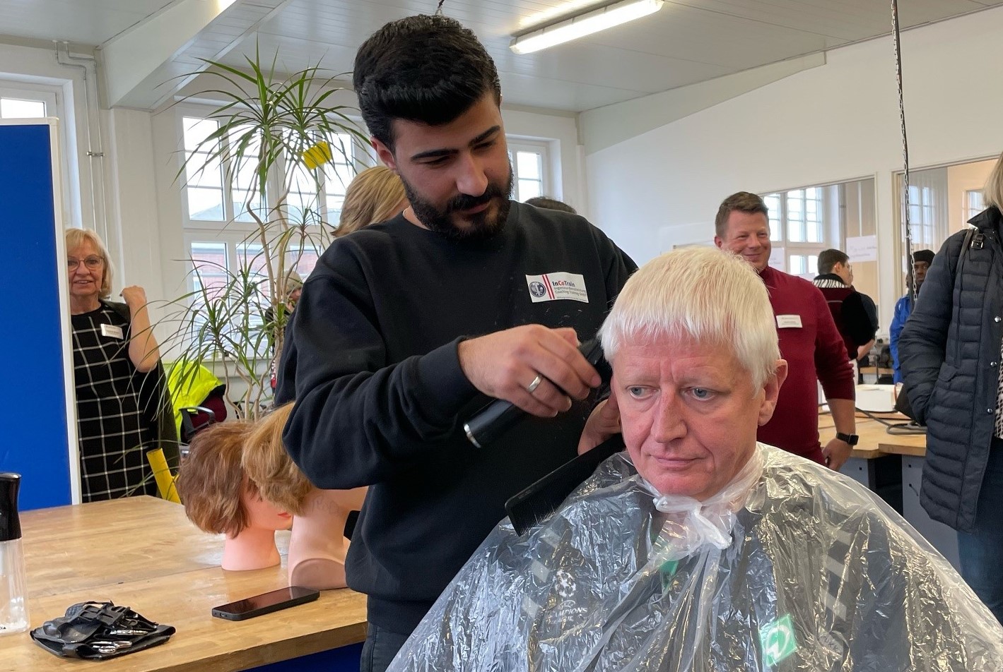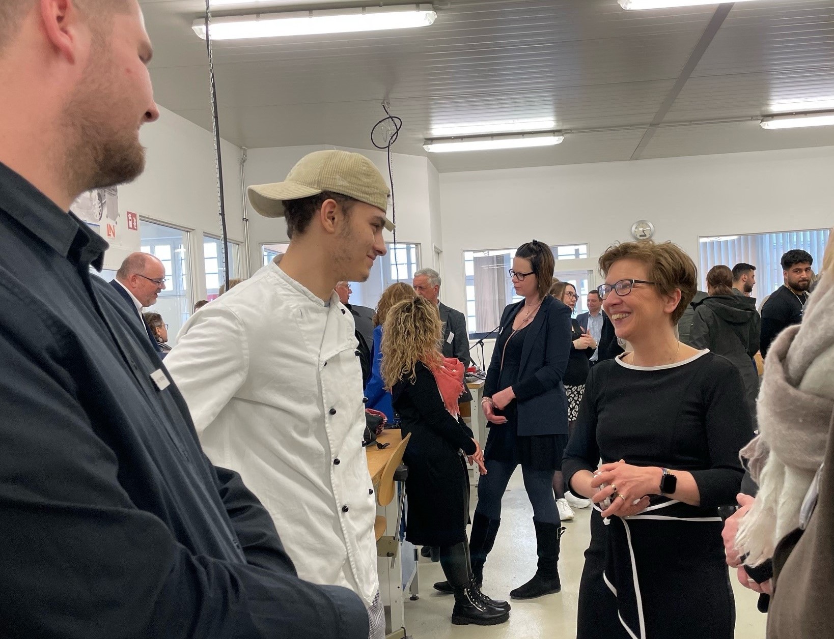 "Nach der Schule habe ich keine Ausbildung gefunden. Aber seitdem ich hier bin, läuft es gut", antwortet Koch-Azubi Yuneil Fearon auf die Frage von Senatorin Dr. Claudia Schilling, warum er das Kochhandwerk bei der Beruflichen Bildung Bremerhaven GmbH lernt. Ein Elektroniker für Betriebstechnik kurz vor dem Abschluss erzählt, dass er demnächst bei der Deutschen Windtechnik GmbH seine erste Stelle antreten wird. Der Koch und der Elektroniker, Damen- und Herrenfriseur-Auszubildende, Gartenbauer und KFZ-Mechaniker: Mehr als 50 junge Erwachsene und ihre Ausbilderinnen und Ausbilder aus den beiden Ausbildungsverbünden standen am Donnerstag, 29. Februar 2024, in den Werkstätten der Beruflichen Bildung Bremerhaven GmbH im Fischereihafen in Bremerhaven Rede und Antwort.