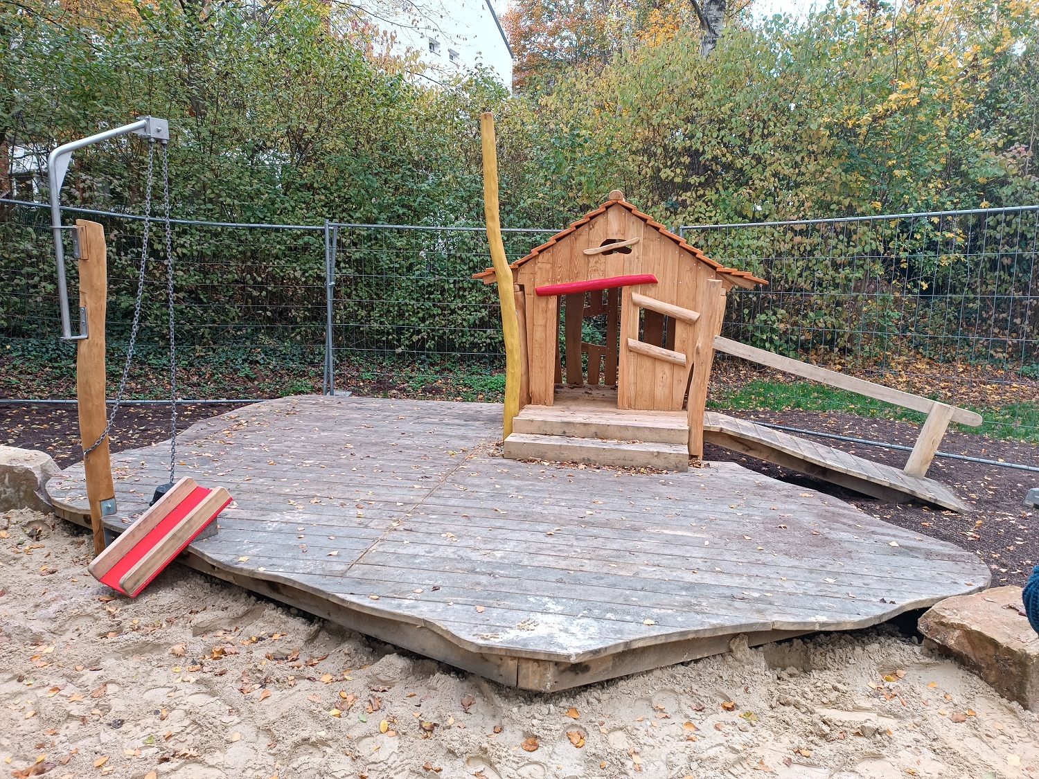 Auch an die Kleinen ist bei der Planung gedacht worden. So wurde der Bereich für Kinder unter drei Jahren überabeitet und der Sandspielbereich an die Bedürfnisse der Kleinsten angepasst. Dazu gehört ein kleines, windschiefes Spielhaus mit Terrasse und Sandaufzug am Rande des Sandspielbereiches. Das alte Karussell ist ersetzt worden durch ein modernes Gerät. Zuletzt ist auch die Tischtennisplatte ersetzt worden.