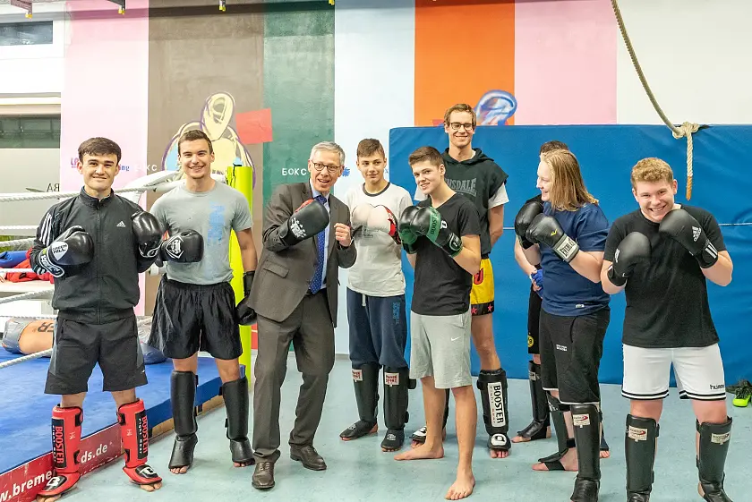 Zum Abschluss besuchte Bürgermeister Sieling den Turn- und Sportverein Huchting (TuS Huchting), bei dem es sich nicht nur um den größten, sondern auch um den ältesten Sportverein Huchtings handelt. Sieling besichtigte zunächst die Boxzeile des TuS Huchting, wo gerade das Thaiboxtraining stattfand.