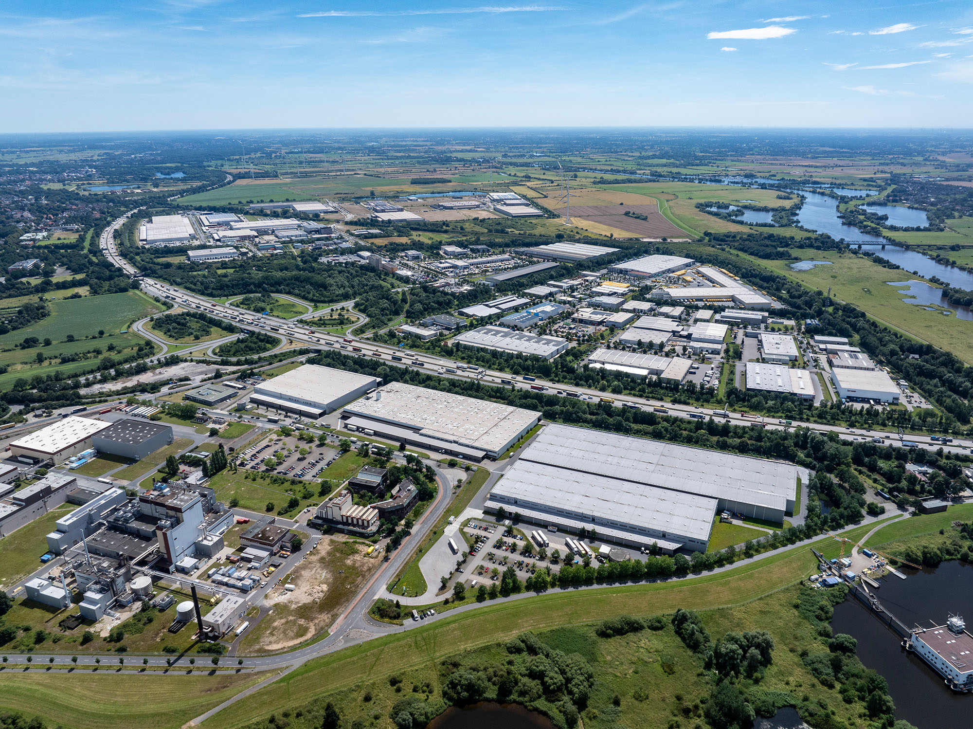 Der Gewerbepark Hansalinie in Bremen aus der Luft. Im Hintergrund sind die Flächen für die 3. Baustufe zu sehen. Foto: WFB / Studio B