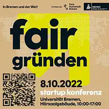 Im Rahmen ihres Projekts "SDG 12: Fair handeln und beschaffen Made in Bremen" veranstaltet die Bremer Senatskanzlei am 8. Oktober 2022 die startup konferenz "fair gründen". Die Konferenz wird von Bürgermeister Dr. Andreas Bovenschulte eröffnet. Sie richtet sich an interessierte Menschen aus den Bremer Diaspora-Communities, die mit Bezug zu einem Land im Globalem Süden entweder eine nachhaltige Projektidee haben oder ein Startup-Unternehmen gründen möchten. Die Teilnehmerinnen und Teilnehmer können an Vorträgen zu Best-Practice-Beispielen aus der startup-Szene teilnehmen und sich über verschiedene Förderprogramm und weitere Unterstützungsangebote informieren.