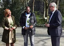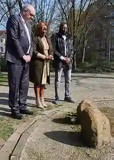 In einer stillen Gedenkfeier gedachten am Sonntag (27. März 2022) Bremens Bürgermeister Dr. Andreas Bovenschulte Windhoeks Bürgermeisterin Sade Shireen Gawanas und Stadtrat Shafiishuna Sam Nujoma im Nelson-Mandela-Park der Opfer der Schlacht von Ohamakari und des Völkermords in Namibia 1904 bis 1908.