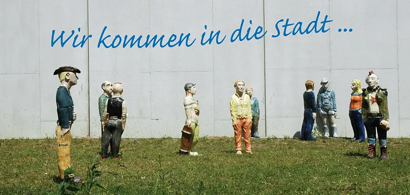 Das Einladungsbild zeigt mehrere Männer in einer Strafanstalt und eine Botschaft: "Wir kommen in die Stadt."
