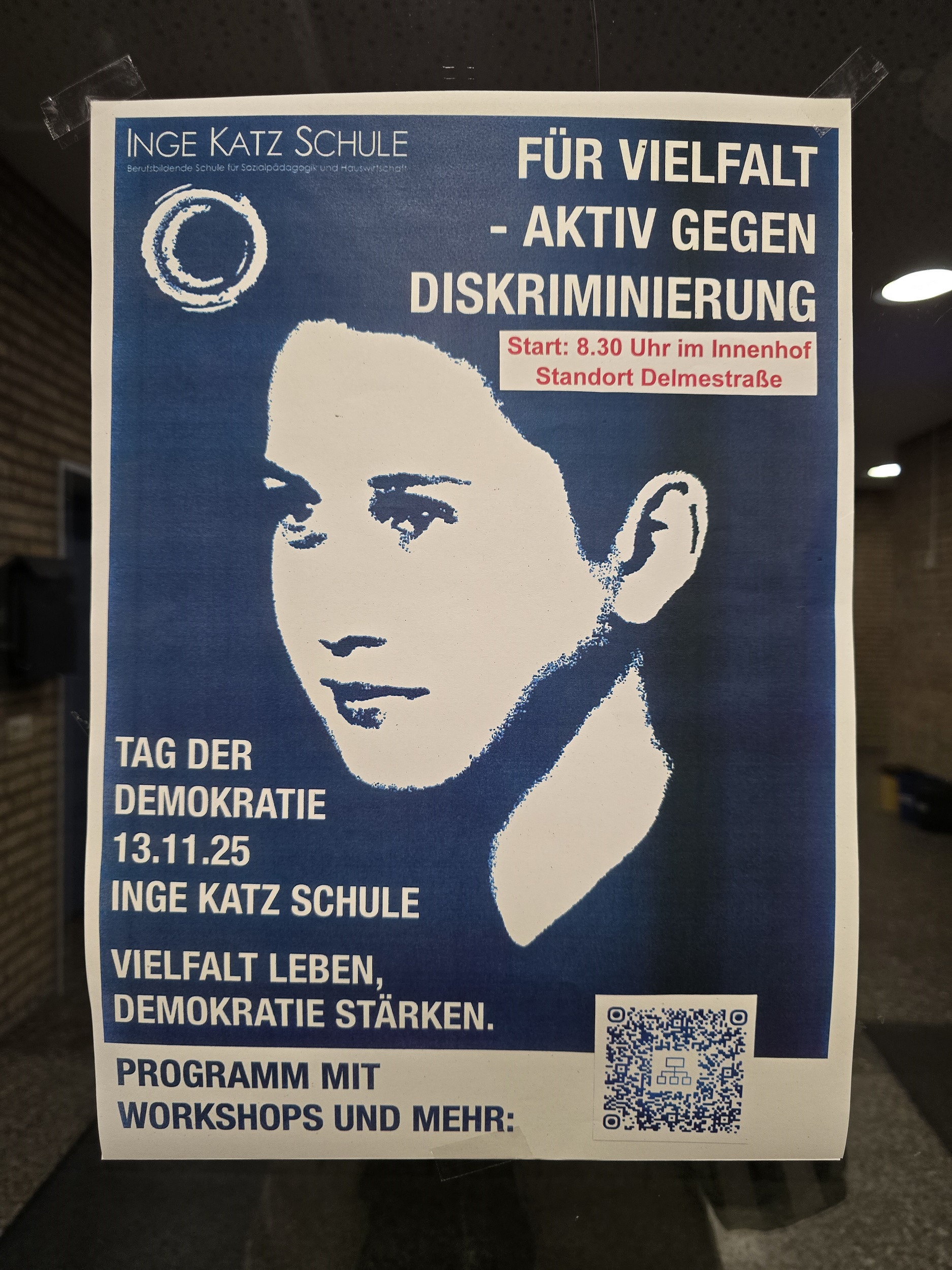 Die Inge Katz Schule veranstaltet am heutigen Donnerstag (13. November 2025) einen Tag der Demokratie. Die Berufsbildende Schule für Sozialpädagogik und Hauswirtschaft hat dafür mehr als 50, hauptsächlich externe, Workshops für die mehr als 1.000 Schülerinnen und Schüler vorbereitet. Einer der Höhepunkt wird das Grußwort der Namensgeberin der Schule sein, das als Video gezeigt wird: Inge Berger (geborene Katz) ist Überlebende des Holocausts und mittlerweile 101 Jahre alt. Heute lebt sie in New York.