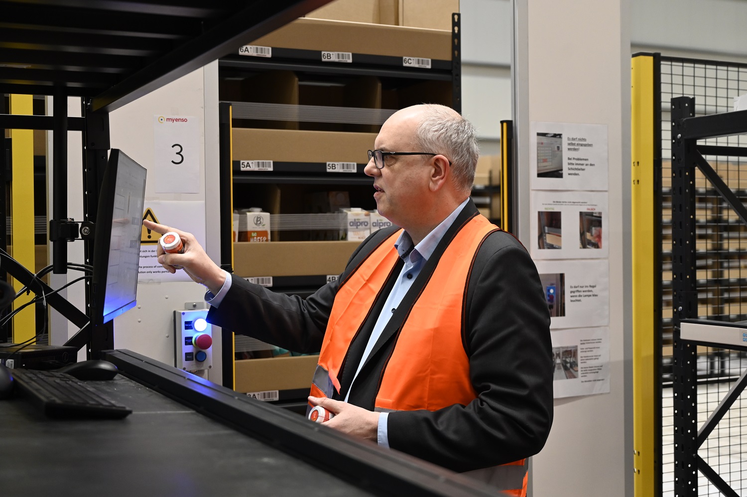 Bürgermeister Andreas Bovenschulte packt im Hochregallager von myEnso mit an. Foto: Senatspressestelle